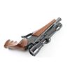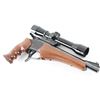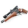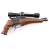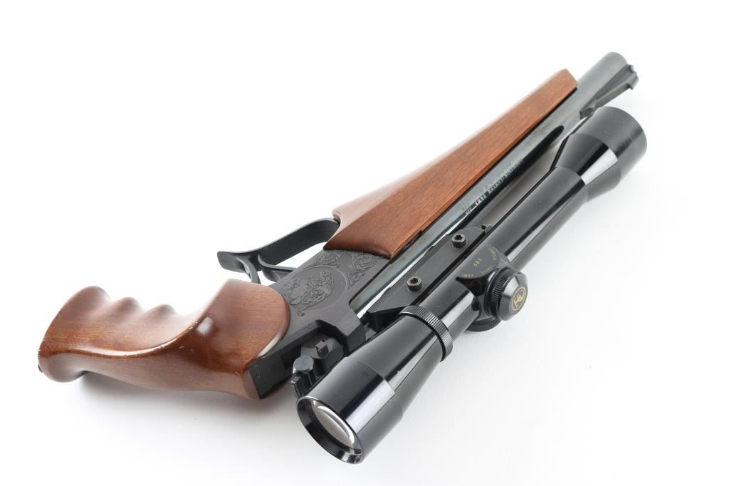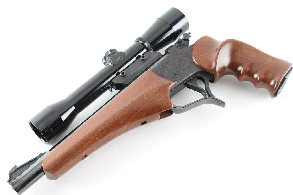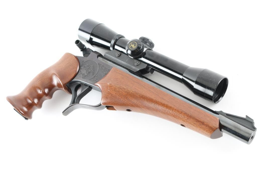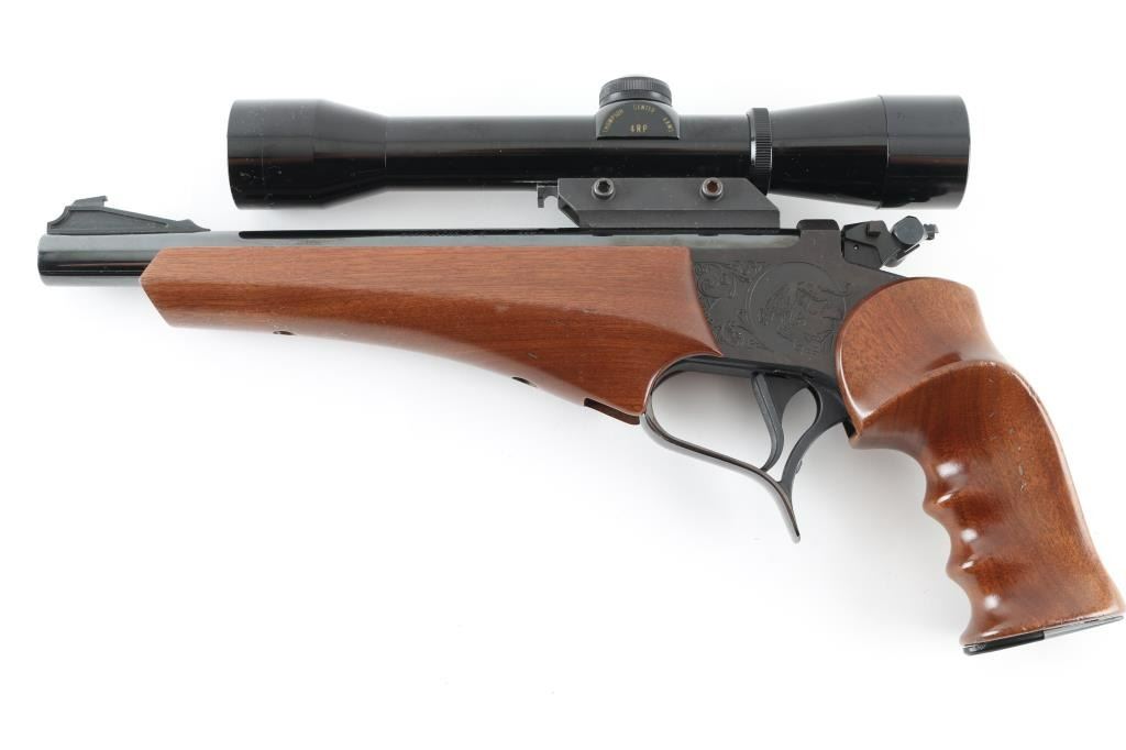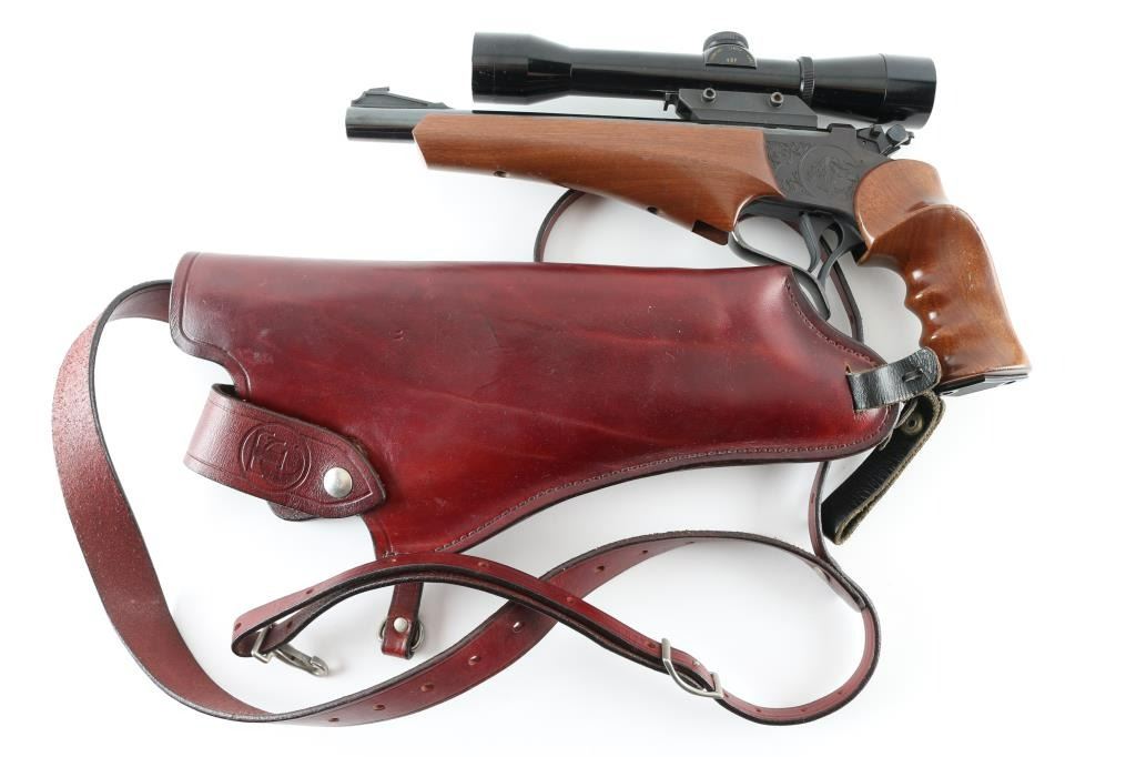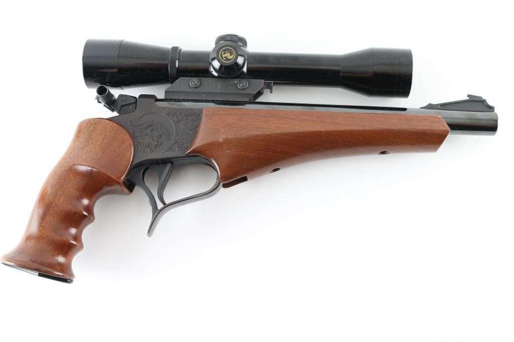 Modular break-action single shot pistol chambered in .223 Remington. It features a blued finish, a 10" heavy barrel with recessed crown, raised patridge front sight, serrated trigger, engraved cougar scene on both sides of the receiver, a three-position firing pin selector/safety switch on the hammer, extended knurled hammer spur and smooth wood forearm and smooth wood finger groove grips with checkered metal grip cap. Comes with a Thompson Center logo leather holster and a Thompson Center 4x scope with mount. Optics are clear. Metal finish looks great with minamal signs of handling. Wood looks good with a few small dings here and there. Bore looks very good, bright, a little dusty. Condition is NRA Very Good *Modern Firearm*