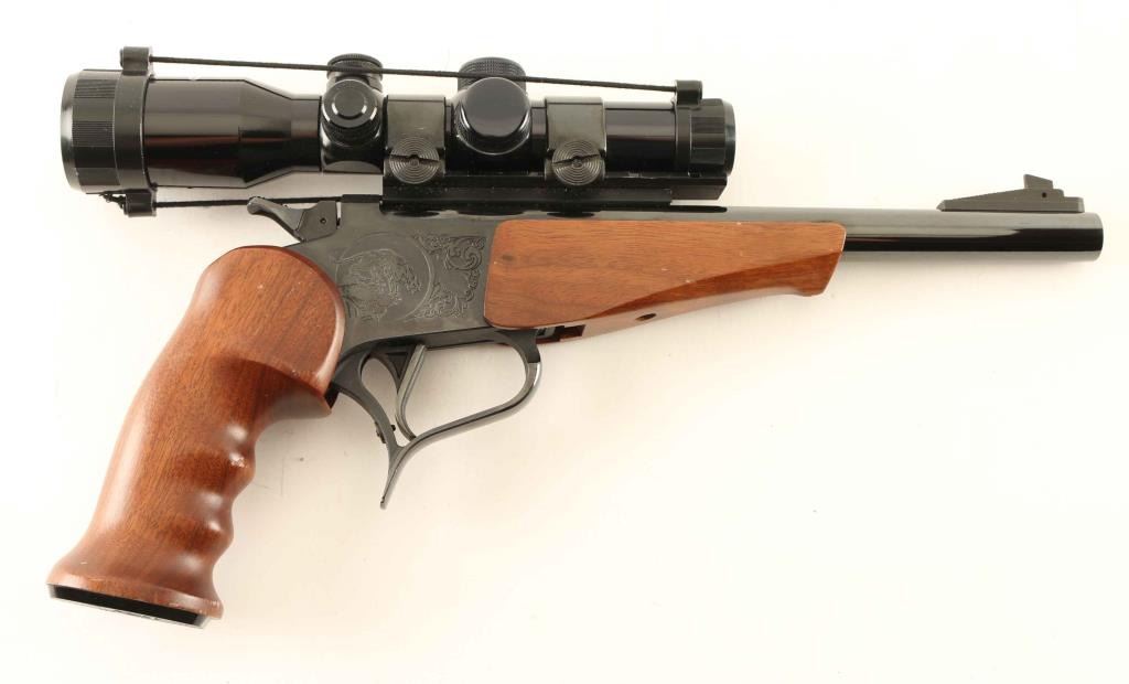Pistol, single-shot, break-top. 98/99% blued finish, with smooth wood finger grooved grips, and forearm. 10" barrel. Bore is excellent/bright. Etched Mountain lion scene on frame. Action is tight, and barrel locks up tight. Triggerguard- barrel release is a little stiff. (Needs oil) Mounted with a Tasco. 1.5x20 scope, with Weaver mounts. Some scratches to the wood, otherwise in almost new condition.