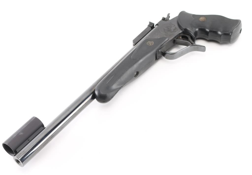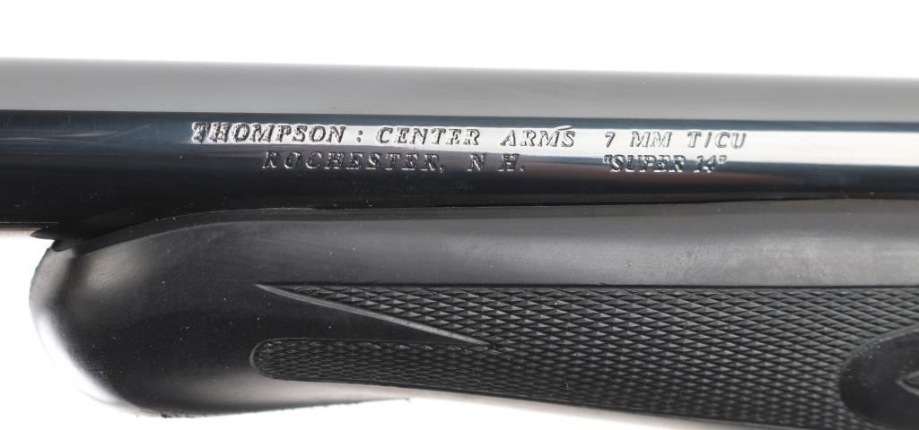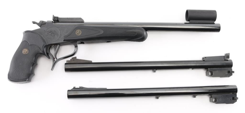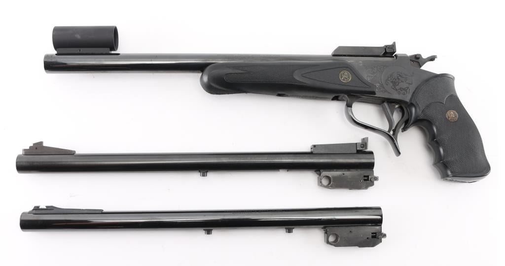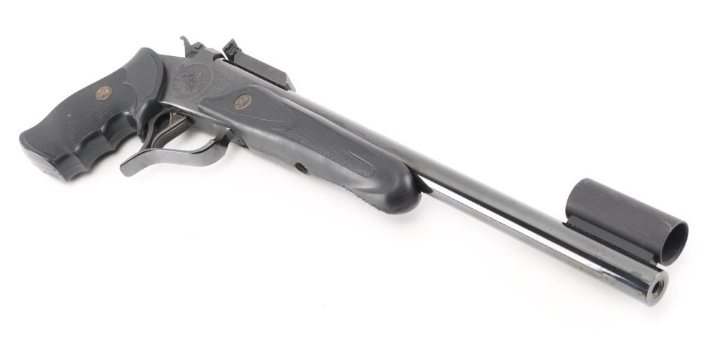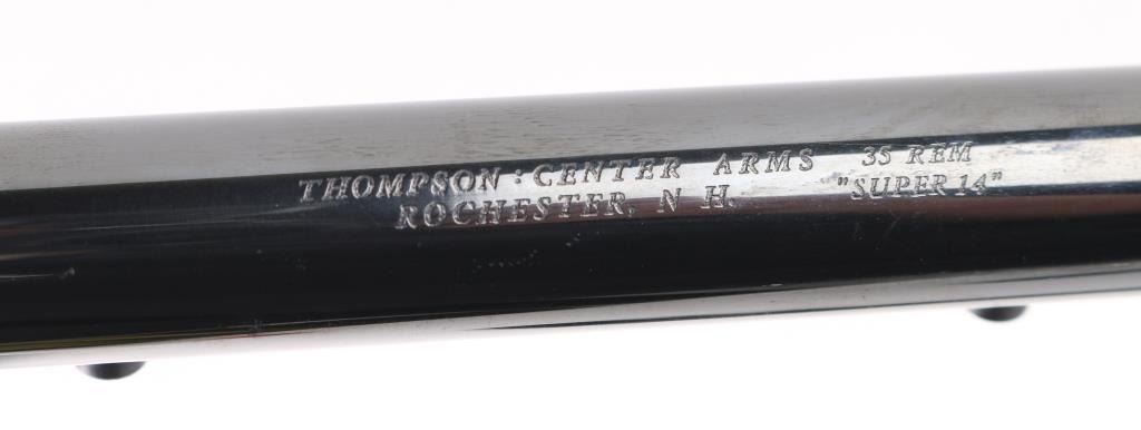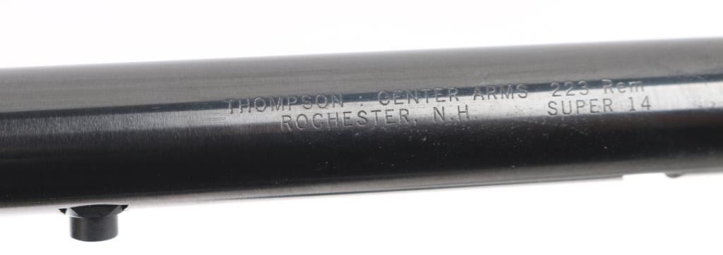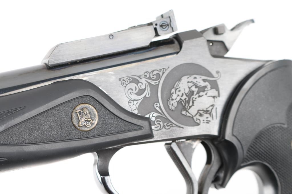 Single shot break open pistol with modular design allowing for easy barrel changes. Features blued finish, engraved Mountain Lion receiver, Pachmayr black forend, black rubber contoured grips, 14" "Super 14" barrel with hooded globe style front sight, micro adjustable rear sight, opening lever forms trigger guard. Bore is very good. Retains 99% blue. Stocks are fine condition. Comes with two "Super 14" barrels, one in .223 Rem, with ramped blade, micro adjustable rear sights, and the other in .25 Rem. dovetailed front ramp with no sight blade, and no rear sights, drilled/tapped. Both in excellent condition. Condition is NRA Excellent. Modern Firearm.