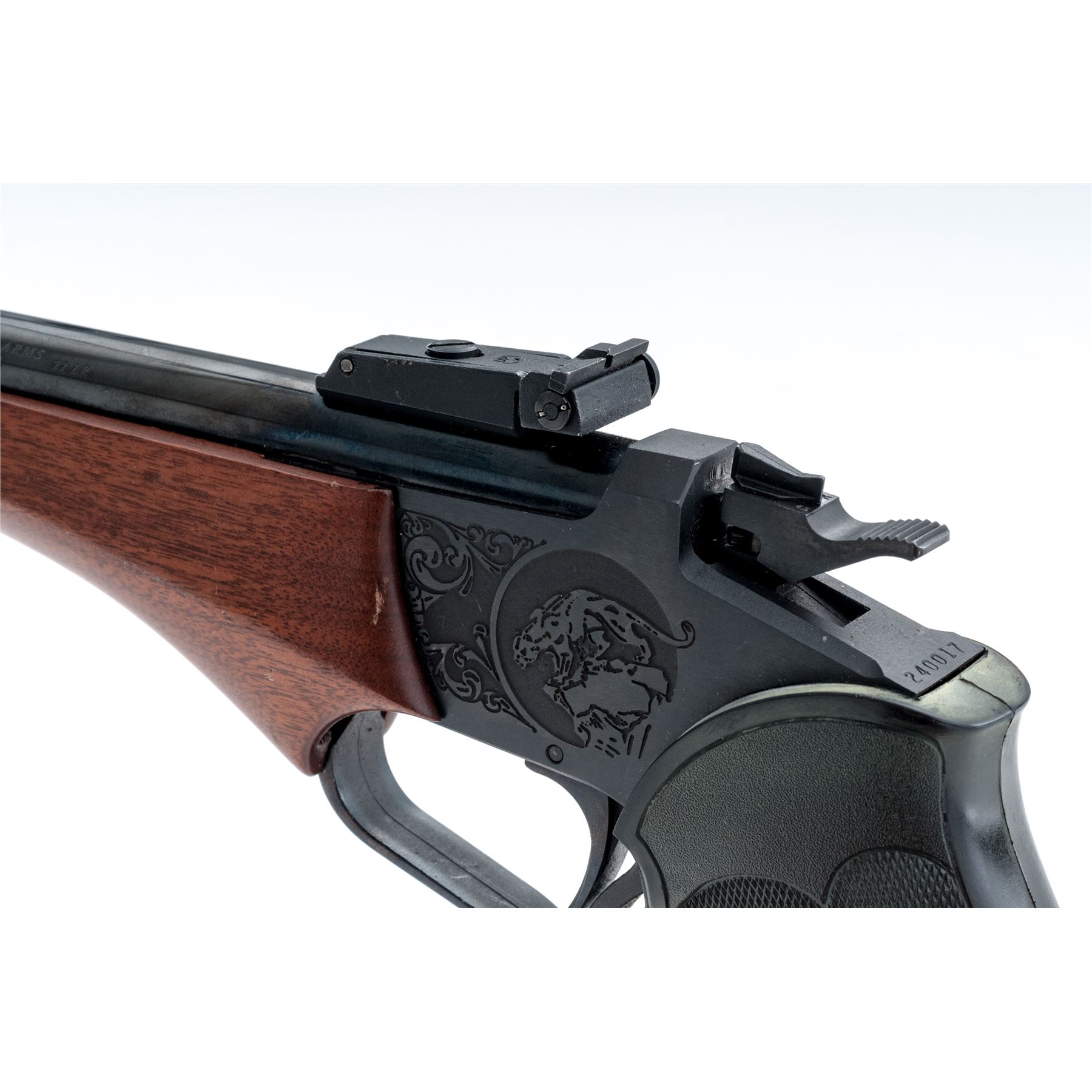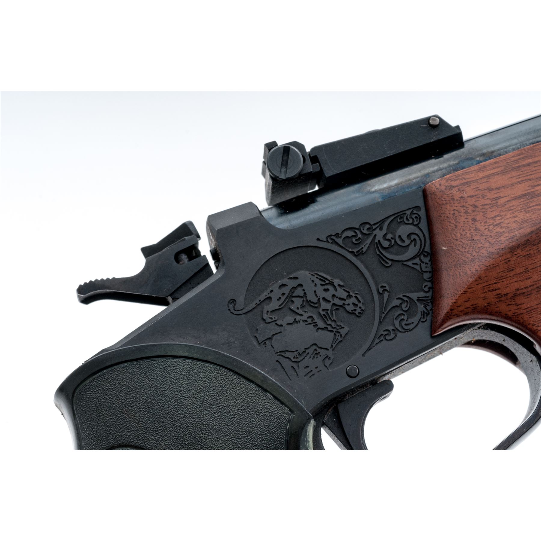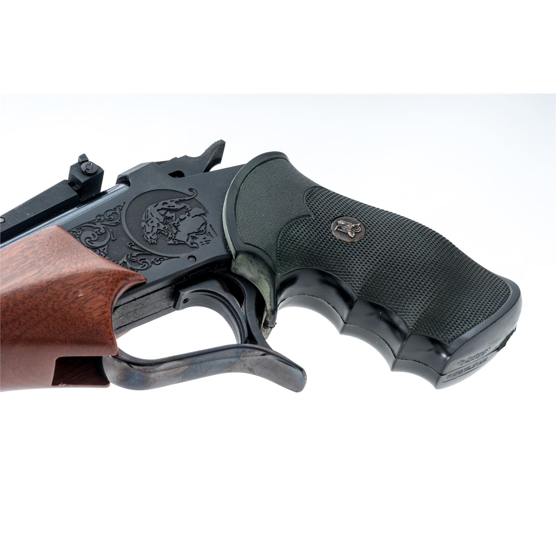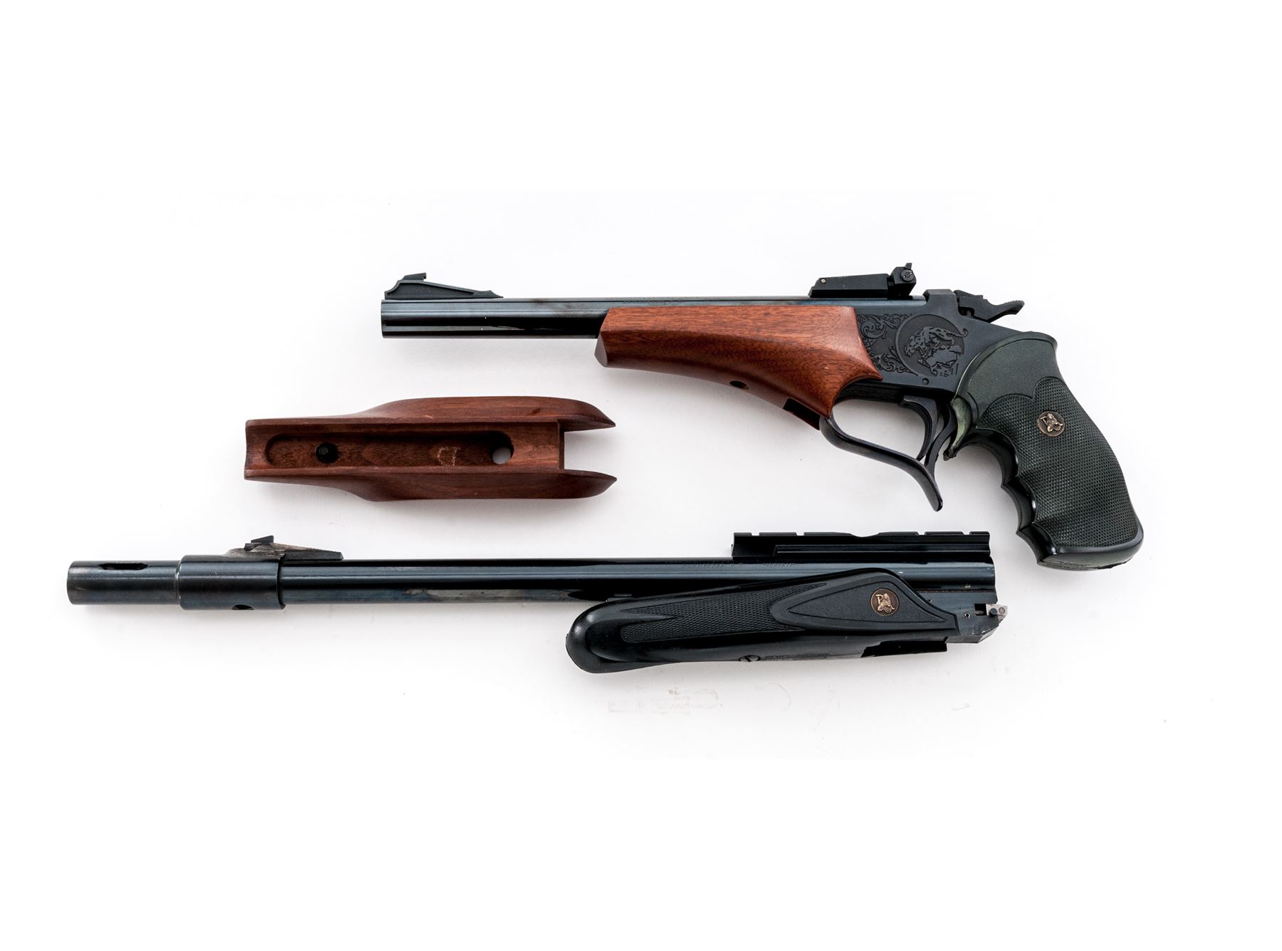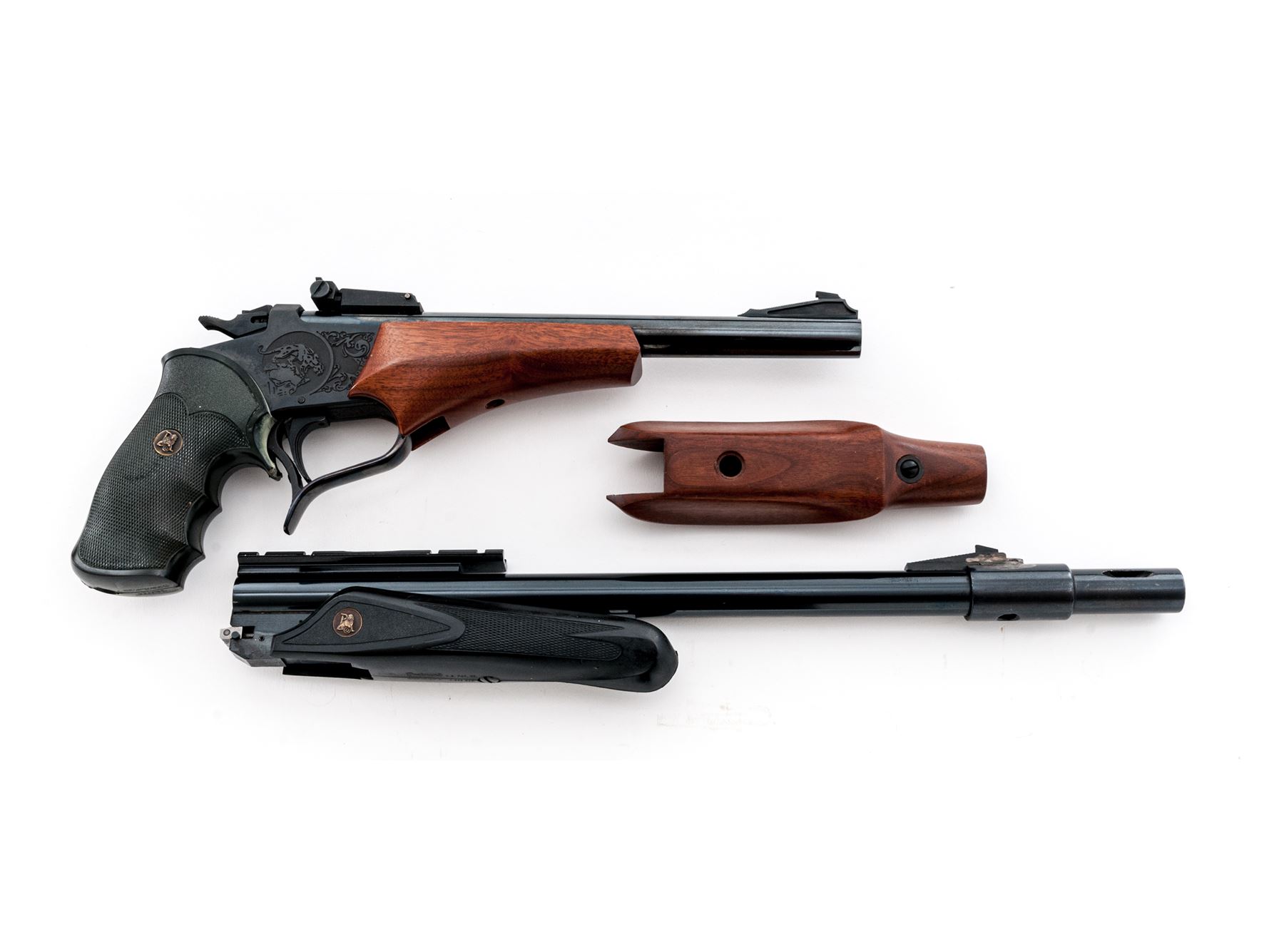 Thompson Center Contender Single Shot Pistol, #240017, .22 LR cal., 10'' barrel with standard adjustable sights, as well as a 14'' compensated barrel in .223 Rem., with modified Weaver scope base; Pachmayr grips to frame, T/C walnut forend to .22 LR barrel along with extra walnut forend; Pachmayr rubber forend to .223 barrel. . Condition is excellent as somewhat modified. Frame and .22 LR barrel are excellent retaining approx. 97% blue, with just light handling marks to walnut forend; .223 barrel is mostly excellent but has had a muzzlebrake brazed on to the front sight. Action remains crisp, both bores are bright. Est.: $450-$650. (Modern/PPT)