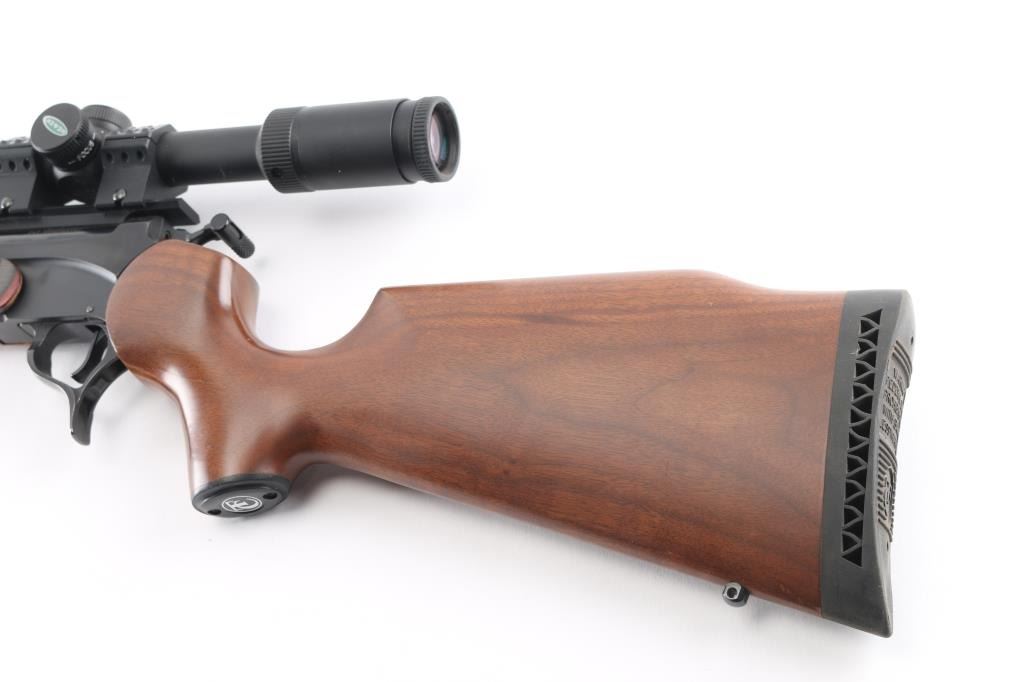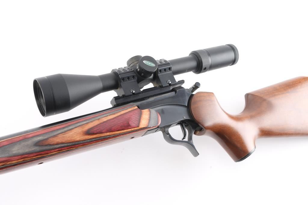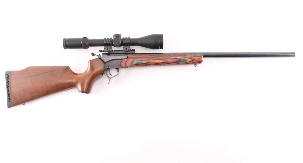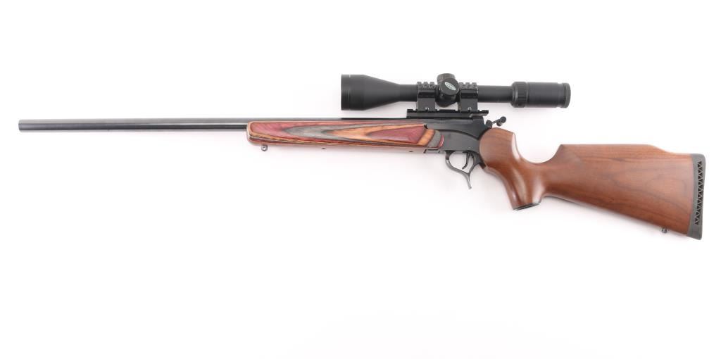 Single shot break open rifle, features blued finish, 26" barrel, no sights, mounted Weaver 4-6 X 44 scope, smooth multi-colored wood forend and brown walnut pistol grip stock with vented rubber butt pad, sling swivel studs, triggerguard release for barrel, exposed hammer with offset spur. Bore is pristine with strong rifling. Retains 98% finish. Wood is good with a hair line cracks around pistol grip. Scope is clear.NRA condition is good++. ***Modern Firearm***