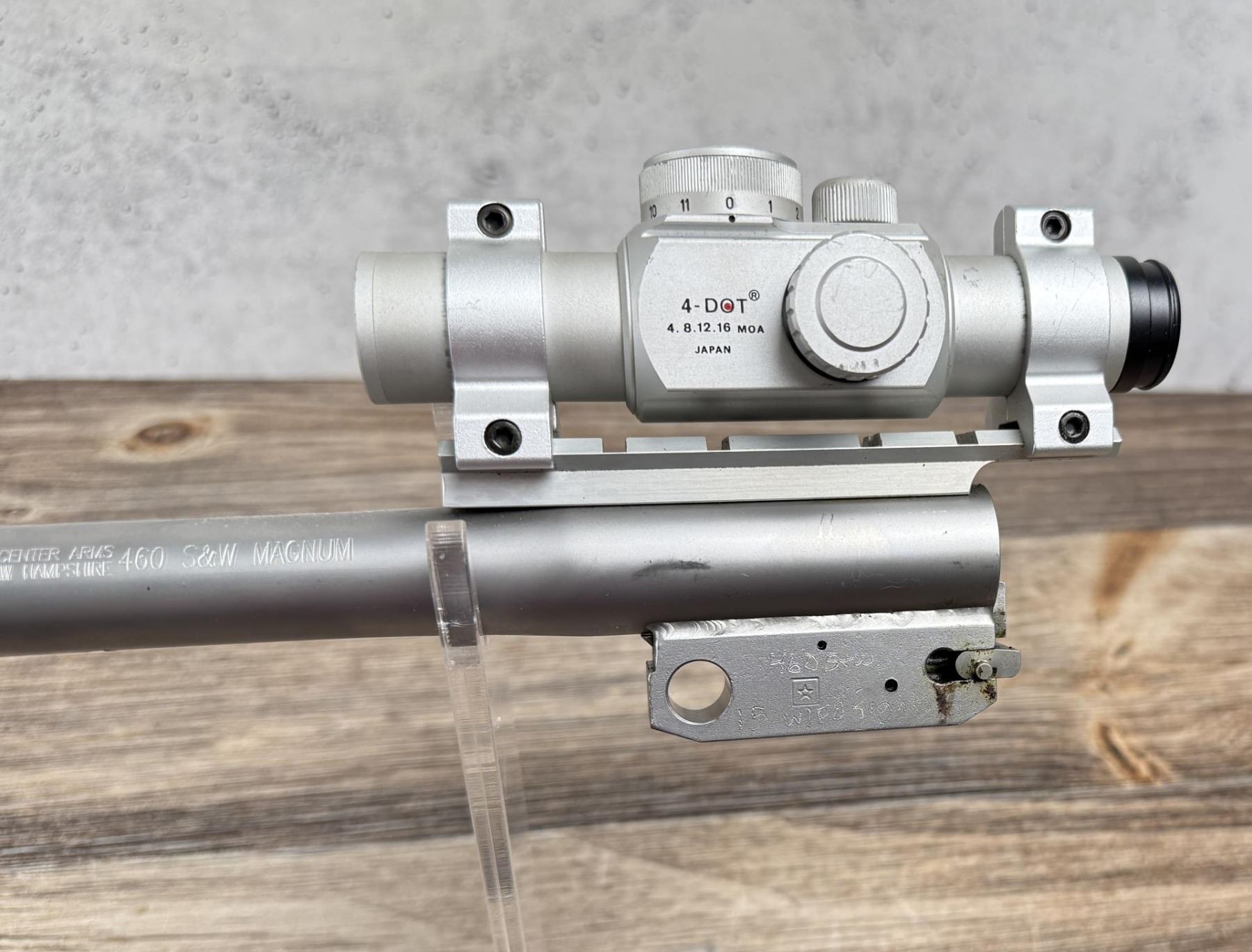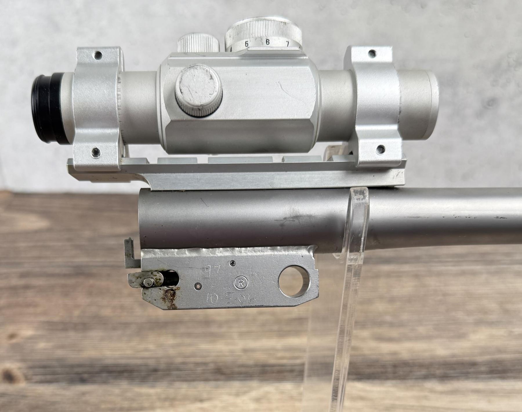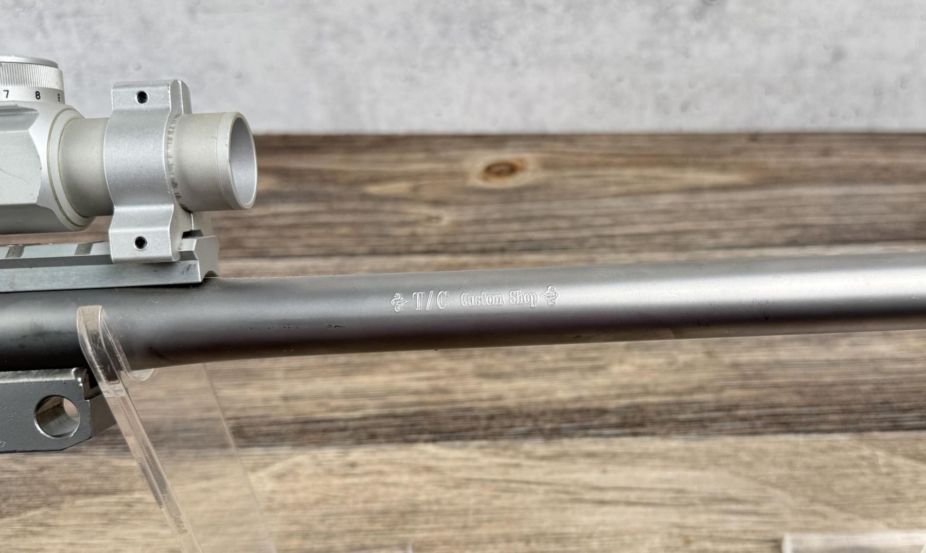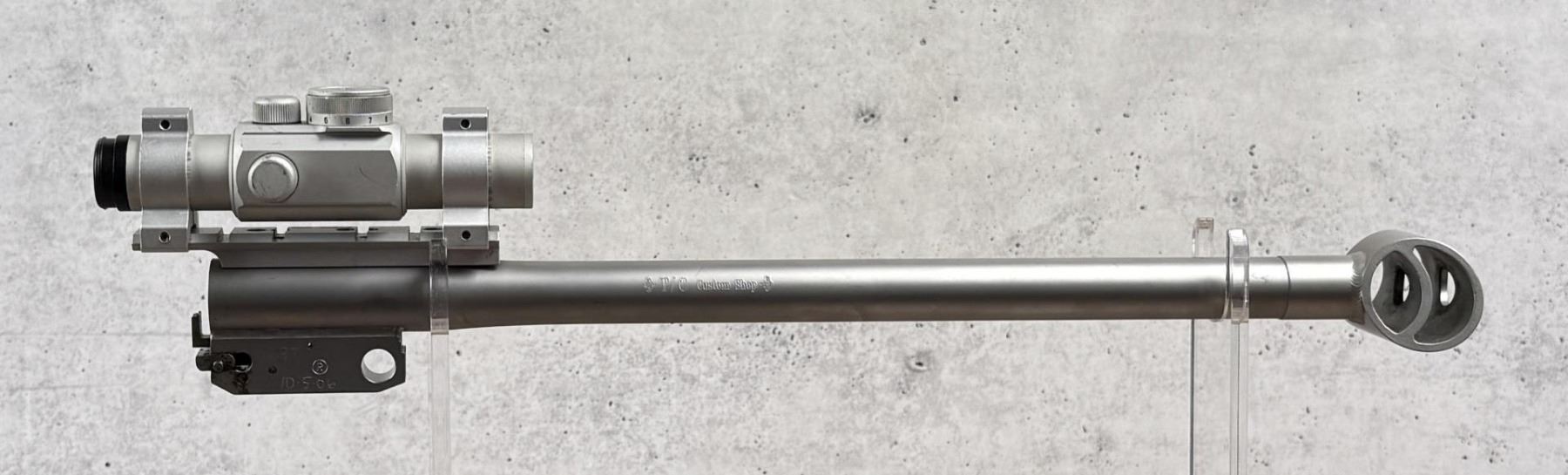Thompson Custom Shop. 18" long with muzzle brake. Matte Stainless. 4-Dot Scope.