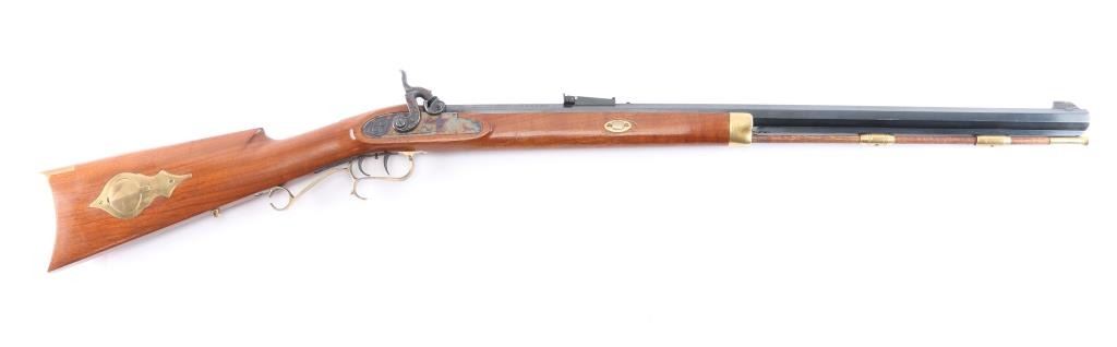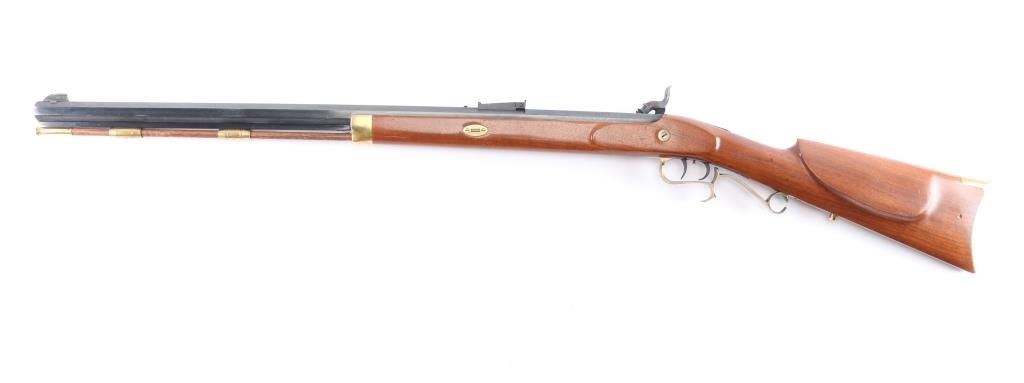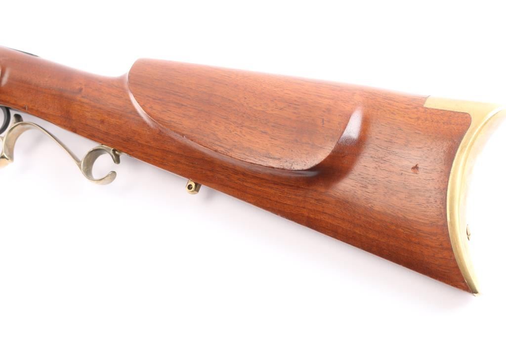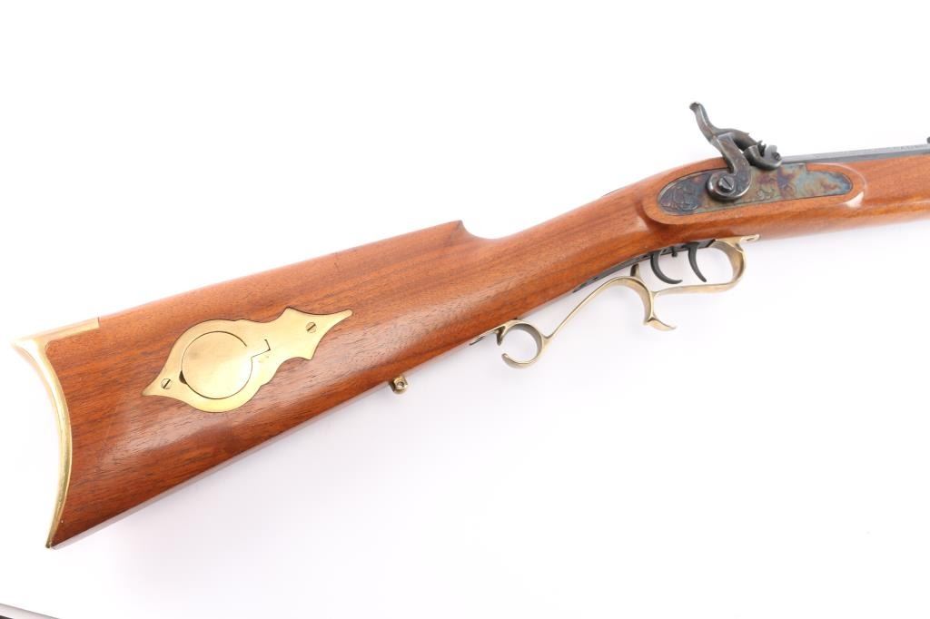 Single shot muzzle loading percussion plains rifle uses Black Powder (or Pyrodex or similar powder) only. Features blued 29" octagon barrel, with a blade/bead front & adjustable barrel mounted rear sight, wood ramrod under barrel, stock with brass plated fittings, right hand cheek rest, crescent buttplate, patch box, double set triggers, case colored lock and hammer. one piece smooth wood stock. Bore is very good, strong rifling, needs cleaning, finish and wood are excellent, two-cock hammer action works well.