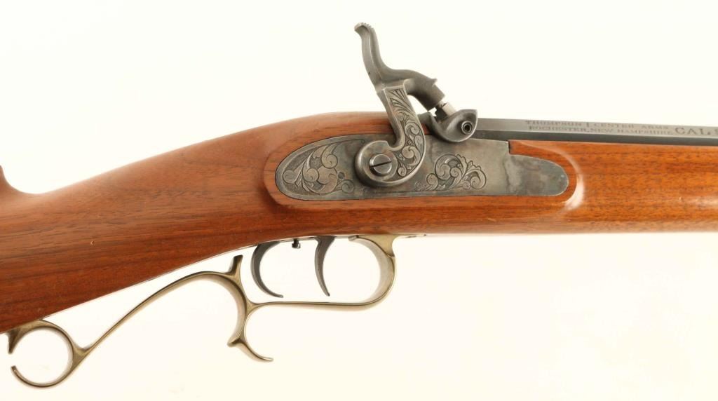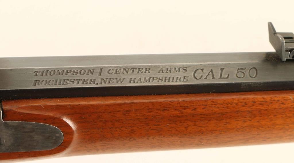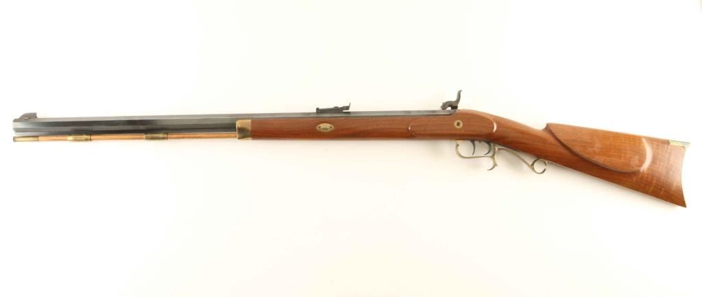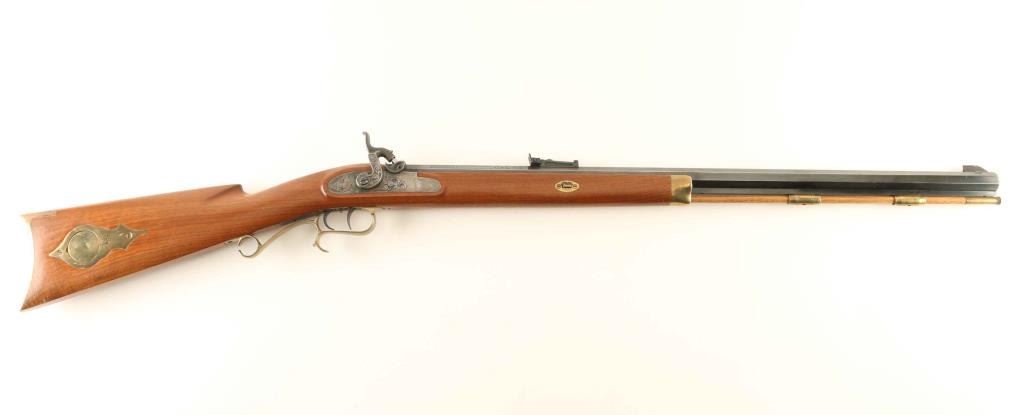 American made muzzle loading percussion rifle in the classic Hawken style, chambered for 50 caliber ammunition. Features a blued & case hardened finish, heavy 28" octagon barrel, dovetailed large blade front sight with bead top, fully-adjustable rear sight, wood ram rod with brass tips, double set triggers, brass finger rest trigger guard, smooth walnut straight grip half stock with right handed cheek rest and brass forend cap, patch box & crescent buttplate. Rifle exhibits approximately 85% of its original finish showing high point edge wear, dulled case colors and a small amount of surface rust on the barrel around the rear sight & forward of the flash pan. Action is sound, the bore is excellent and the wood stock is near fine with a few minor imperfections. Condition is Very Good. ***Antique Firearm***