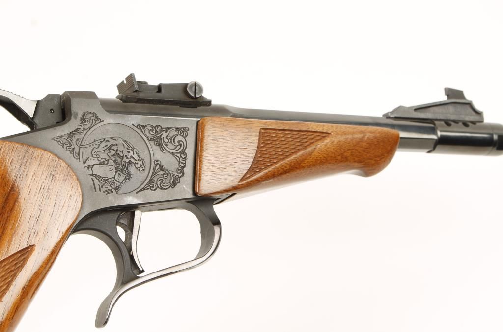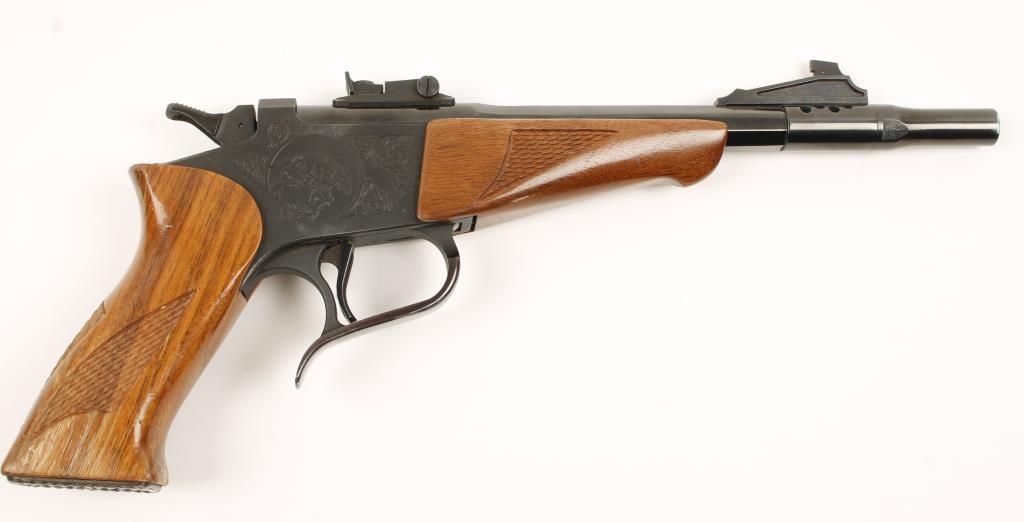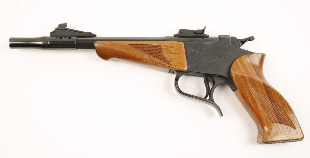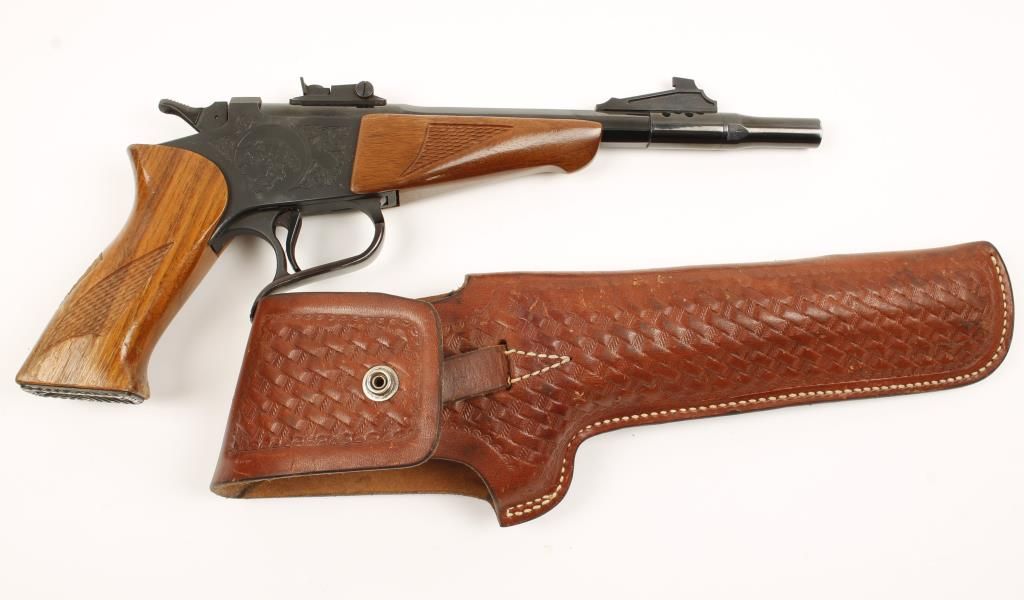 Early single shot break action pistol with 10" octagon barrel with muzzle break and shot stabilizer. Blued finish, checkered wood thumbrest grips and forend, 1st gen hammer, partridge front sight and adjustable rear sight. Good bore and action. Includes Thompson Center Arms leather holster with basket weave pattern. Condition: Good to very good showing small amount of bluing wear and grips shop wear. *Modern Firearm*