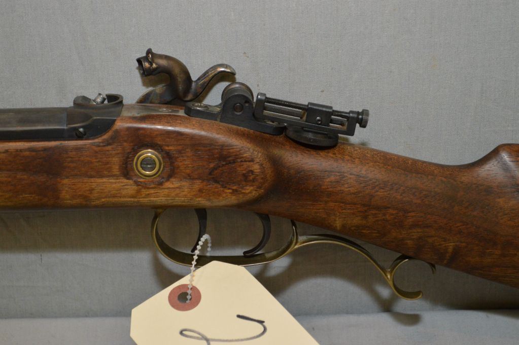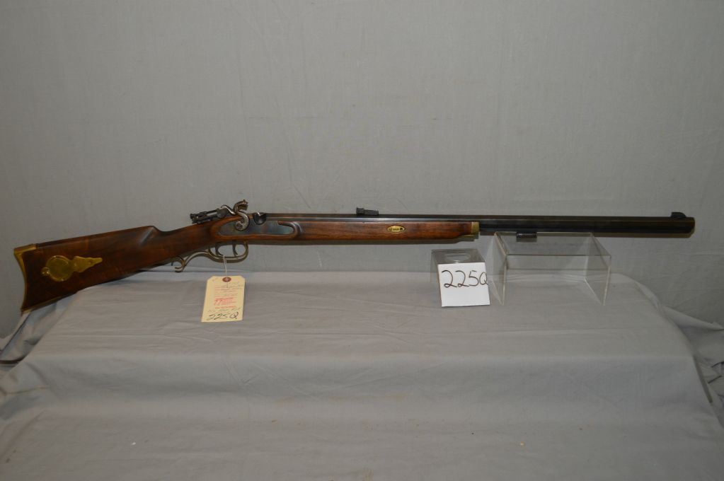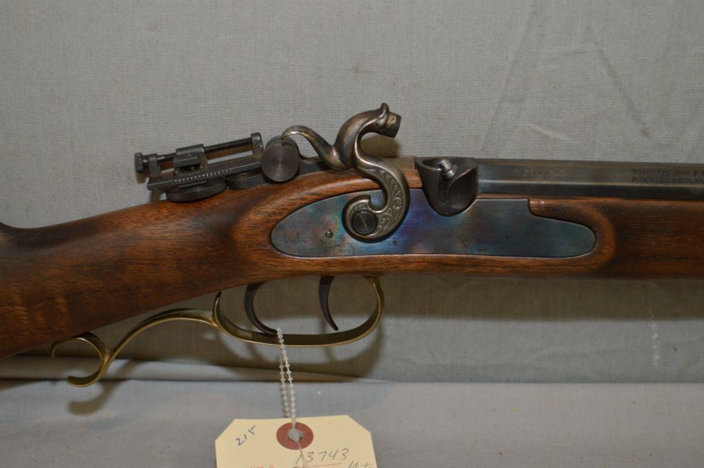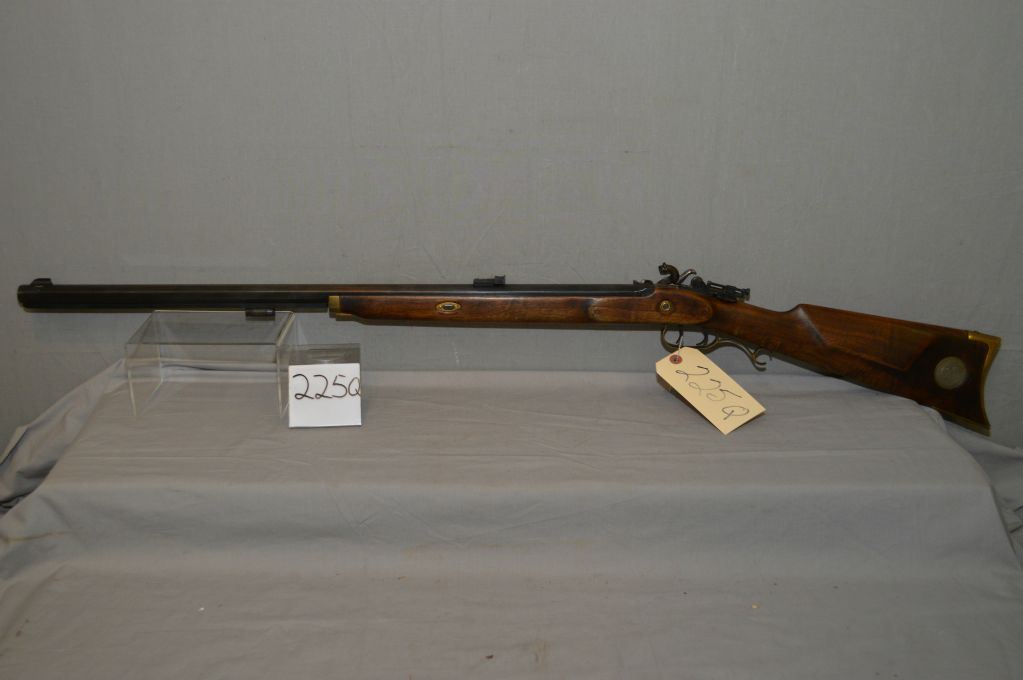 Thompson Center Model Muzzle Loading .36 Perc cal Black Powder Rifle w/ 27" oct bbl [ fading blue finish w/barrel sights, & tang adjustable peep sight, case colored lock & hammer, double set trigger, brass furniture including patch box,etc, half stocked w/ raised cheek piece, note : U.S. One dollar coin inlaid in left side of stock, missing ramrod ] Ser # 13743
