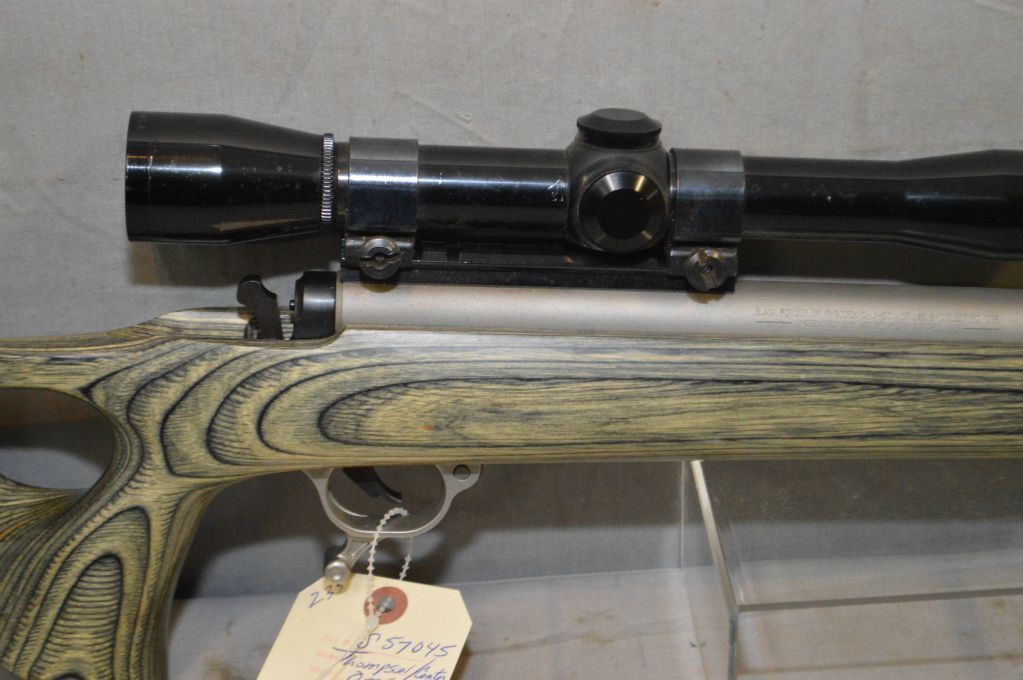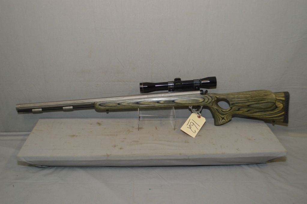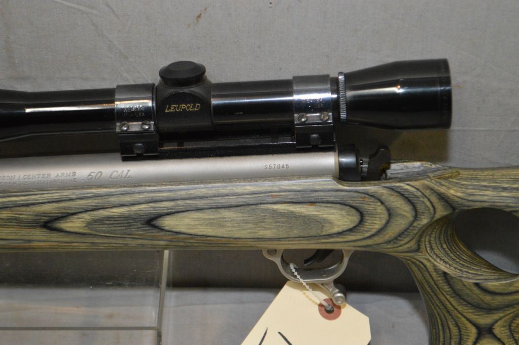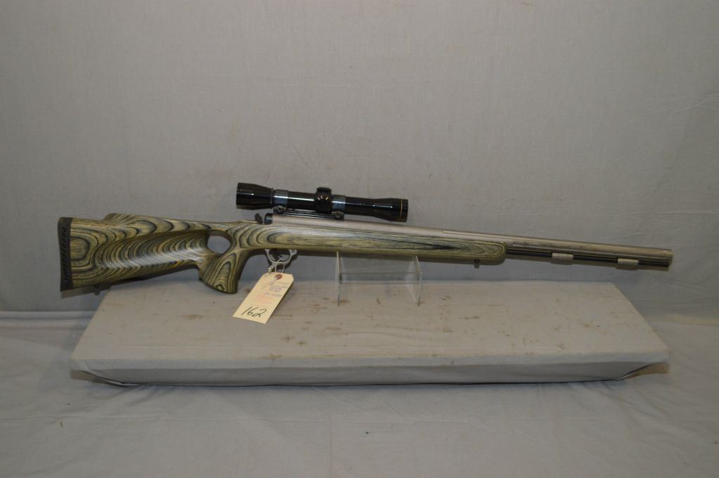 Thompson / Center Model Omega .50 Perc Cal Inline Black Powder Rifle w/ 28" flat stainless fluted bbl [ barrel sights removed, some discoloration to the barrel, green & black laminated thumb hole pistol grip stock, w/ T/C recoil pad, composite ram rod, fitted w/ Leupold M8 - 4X scope in Weaver rings & base ] Ser # S57045
