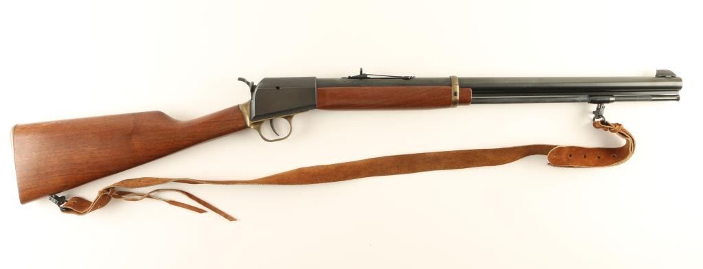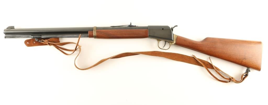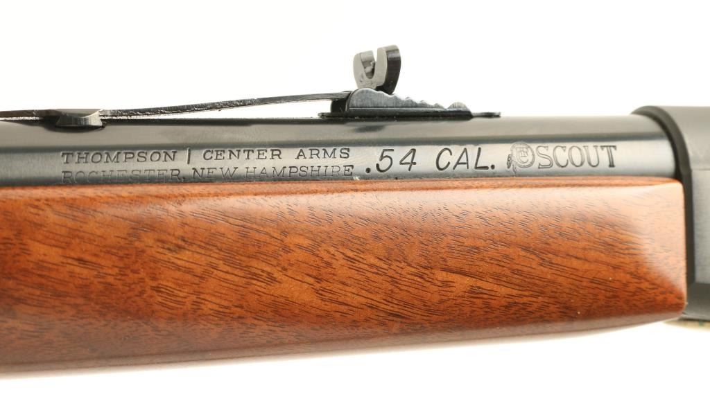 Modern production percussion muzzle loading rifle chambered for .54 caliber ammunition. Features a blued finish, heavy 23" barrel, ramrod, large blade front sight, adjustable rear sporting sight, drilled & tapped receiver, smooth trigger, serrated hammer spur, brass trigger guard, leather sling, smooth wood forend and straight grip shoulder stock with brass buttplate. Rifle shows some light handling marks on barrel with 97% finish intact overall. Action is crisp, bore is clear and wood stocks are fine. Condition is near excellent. ***Antique Firearm***