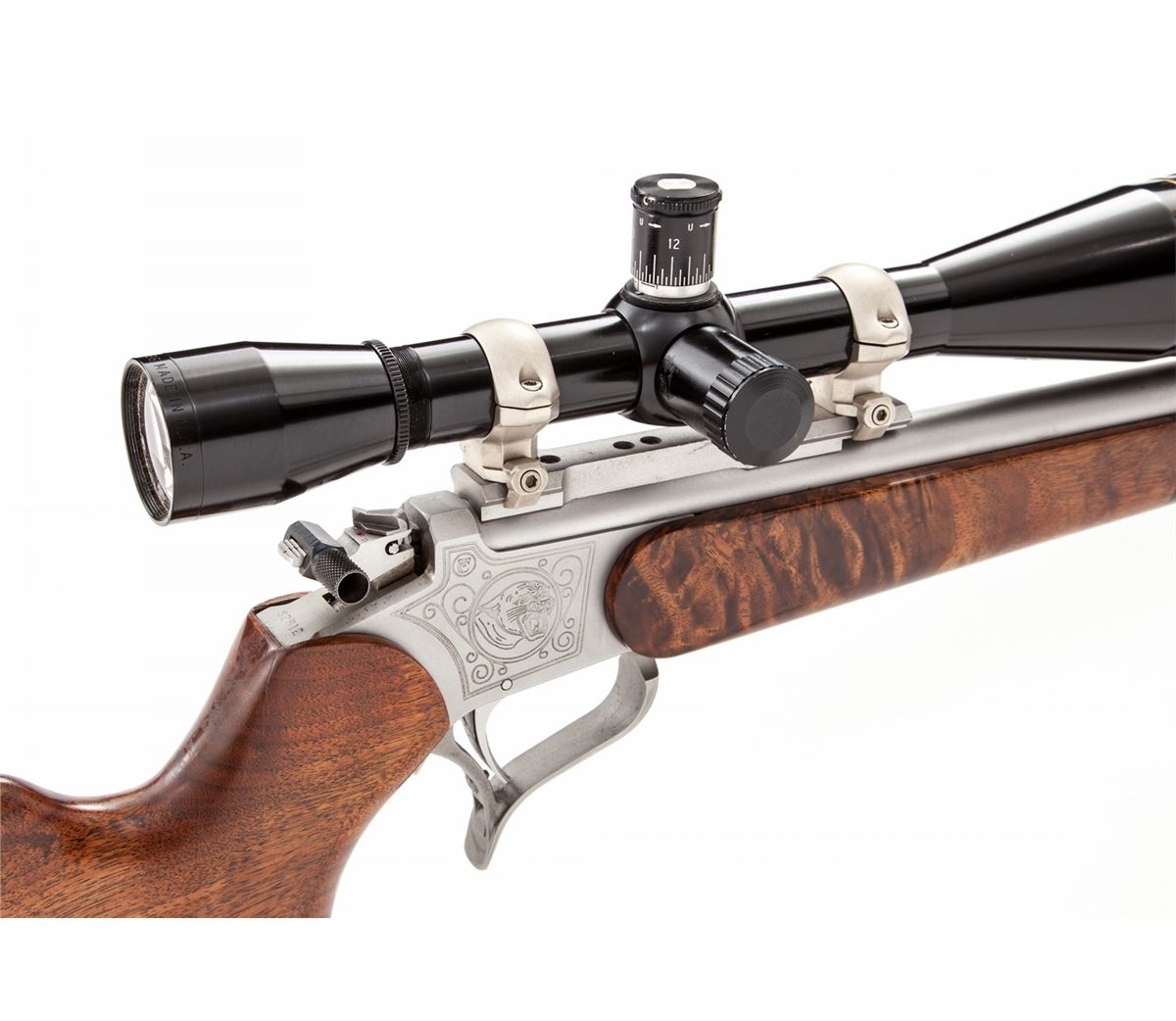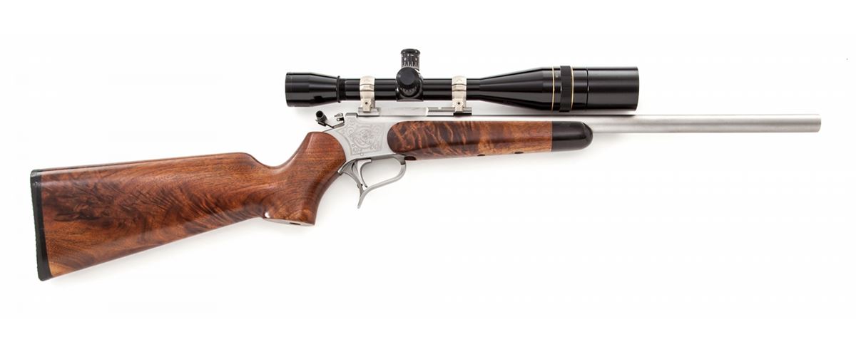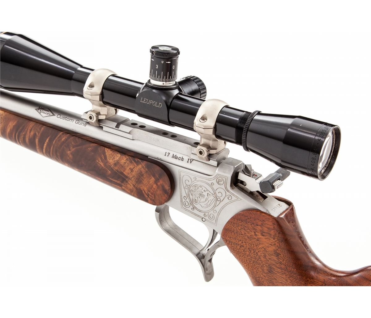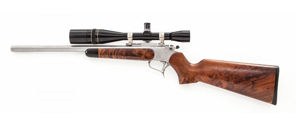 Thompson Center Single Shot Carbine, #S2812, .17 Mach IV cal., 20'' Virgin Valley Custom Guns barrel, stainless steel, fancy walnut stock and forend. Topped with a Leupold 12-power target scope with sunshade. Condition is excellent showing light range use. Scope elevation cap is missing. Action is crisp, bore is bright. Est.: $500-$750. (Modern)