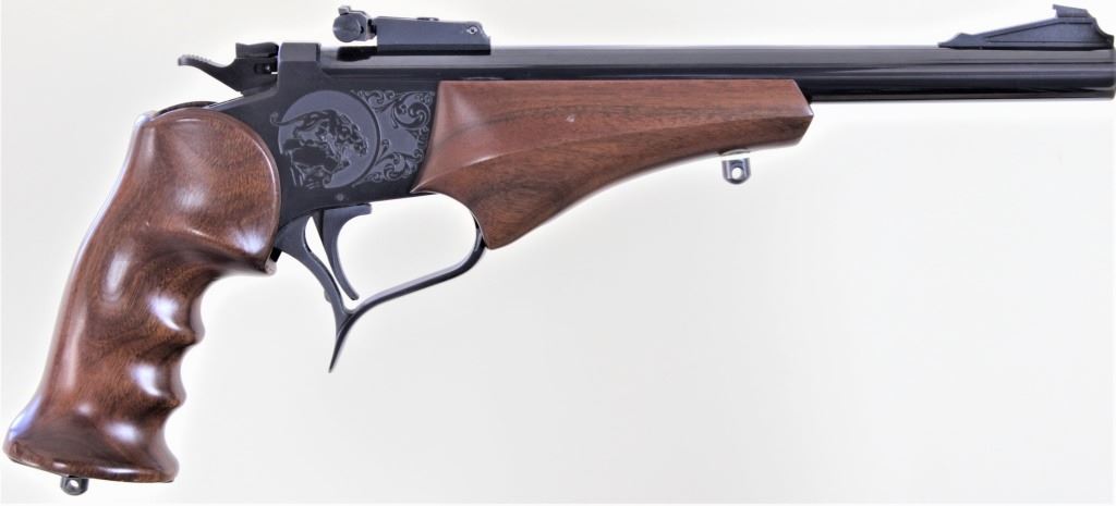 Thompson Contender .22 LR SN 311677 single shot pistol blued finish, walnut grips with 10" bull barrel, ramp front sight, adjustable target rear 2nd variation with toggle on hammer. Frame shows standard etched cougars stamped TCA-C on front of frame allsingle shot pistol blued finish, walnut grips with 10" bull barrel, ramp front sight, adjustable target rear 2nd variation with toggle on hammer. Frame shows standard etched cougars stamped TCA-C on front of frame all in very good with only acouple of light handling marks the screws in lanyard ring plate showing the worst. Includes Thompson Center Arms holster. From old St. Louis collection. FFL/Modern. Est. 275-375