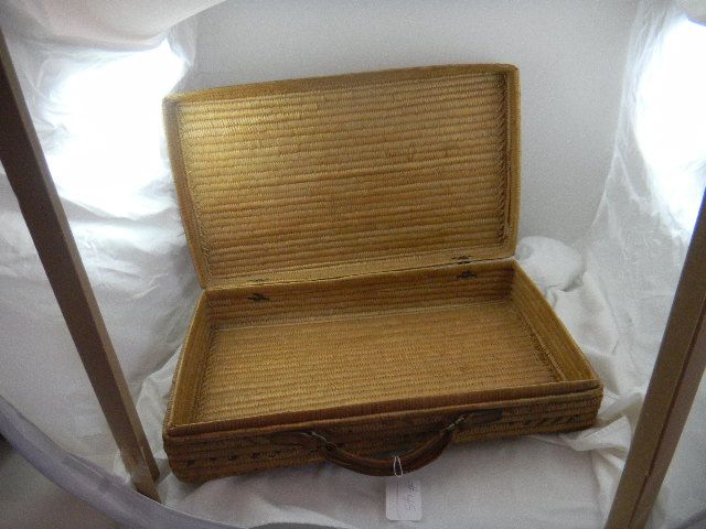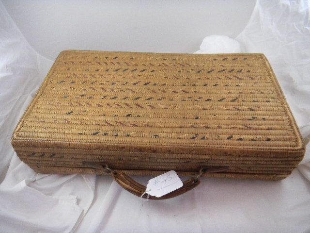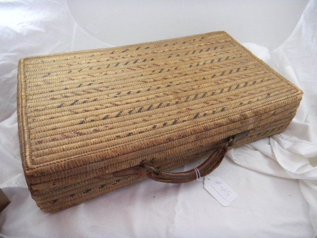 Thompson River Basketry Suitcase with leather handle. Measures 22x12x5 inches. This is from 1920 some stitch loss