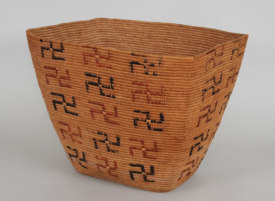 Thompson River Burden Basket Imbricated with Five Row of Rolling Logs 18" L. 13 3/4" W. 13 3/4" H. Good Condition with Very Minor Rim Loss