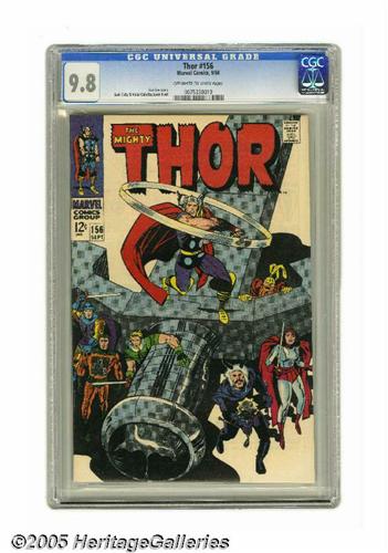 <B>Thor #156 (Marvel, 1968) CGC NM/MT 9.8 Off-white to white pages.</B></I> A super-sharp copy from Jack Kirby's heyday as penciler of this title -- what more could the Silver Age Marvel fan ask for? This one's from the Mangog saga, in which a cosmic entity formed from billions of beings is on its way to destroy Asgard. Overstreet 2005 NM- 9.2 value = $60. CGC census 1/05: 11 in 9.8, 1 higher.