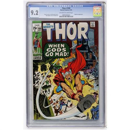 <B>Thor #180 (Marvel, 1970) CGC NM- 9.2 Off-white to white pages.</B></I> Mephisto appearance. John Buscema cover. Neal Adams and Joe Sinnott art. Overstreet 2007 NM- 9.2 value = $60. CGC census 3/08: 6 in 9.2, 14 higher. <I> From the Furfferi Collection.</B></I><BR><BR><b>Shipping:</b> Comics - Slabbed (certified) (<a target="_blank" href="http://www.heritageauctions.com/common/shipping.php">view shipping information</a>)