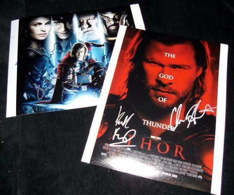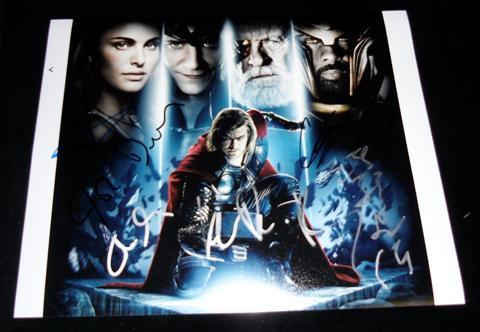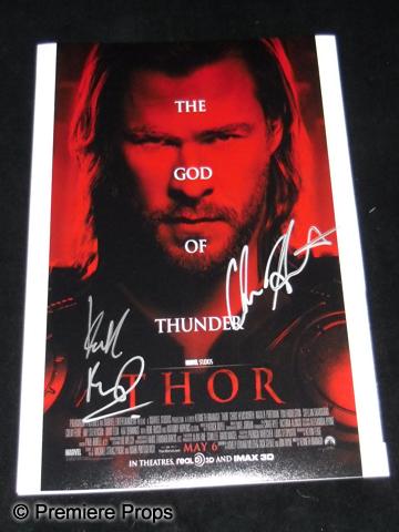 Thor Autographed Cast Photos - One of this spring's biggest action films, “Thor” 11x14 poster signed by Chris Hemsworth (Thor) and the movie's director Kenneth Branagh. Also comes with an additional 11x14 photo signed by Chris Hemsworth (Thor), Kenneth Branagh (Director) , Jamie Alexander (Sif), Josh Dallas (Fandral), Colm Ferore (King Laufey), Clark Gregg (Agent Coulson) and Tadanobu Asano (Hogun). Signed in person at the Hollywood premiere on May 3, 2011.