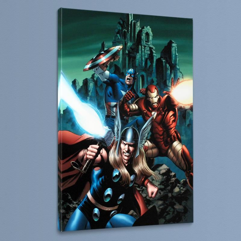 A piece of comic book history, this limited edition print, drawn by Steve Epting, depicts the heroic Thor, Iron Man, and Captain America. Steve Epting began working with Marvel Comics in the early 1990s; his first assignment was a six part Avengers series, thereafter he became a full time penciler on the Avengers. More recently Epting has been working on the Fantastic Four as well as Captain America. "Thor #81" is a limited edition giclee on canvas by Steve Epting presented by Marvel Comics! This piece comes gallery wrapped and ready to hang. Includes Certificate of Authenticity! Measures approx. 18" x 27" (image).