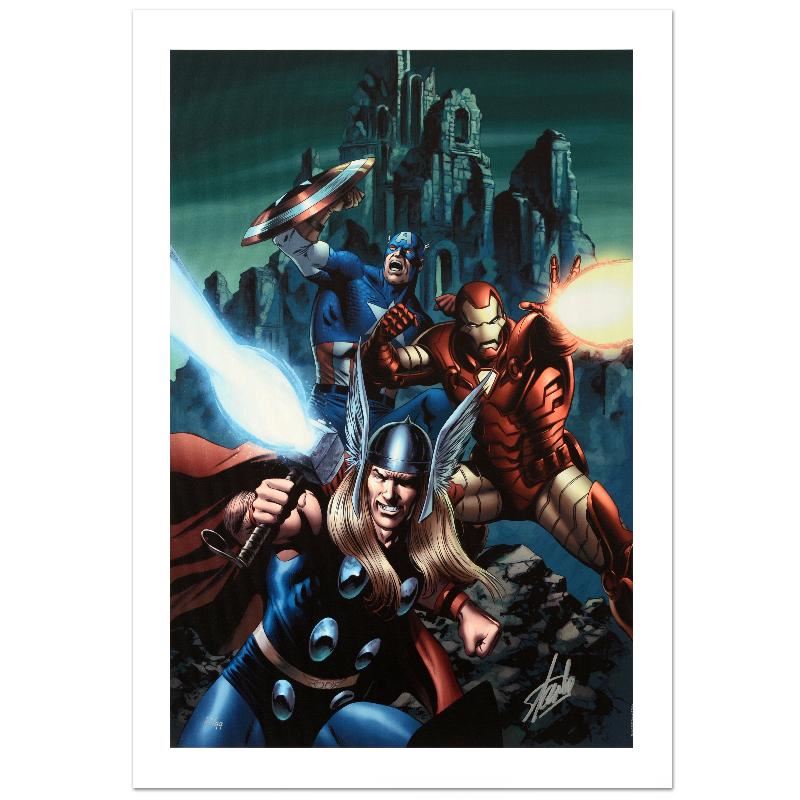 A piece of comic book history, this limited edition, from original art by Steve Epting, depicts the heroic Thor, Iron Man, and Captain America. Steve Epting began working with Marvel Comics in the early 1990s; his first assignment was a six part Avengers series, thereafter he became a full time penciler on the Avengers. More recently Epting has been working on the Fantastic Four as well as Captain America. "Thor #81" is a limited edition giclee on canvas by Steve Epting presented by Marvel Comics, numbered and hand signed by the great Stan Lee! Includes Certificate of Authenticity! Measure approx. 18" x 27" (image).