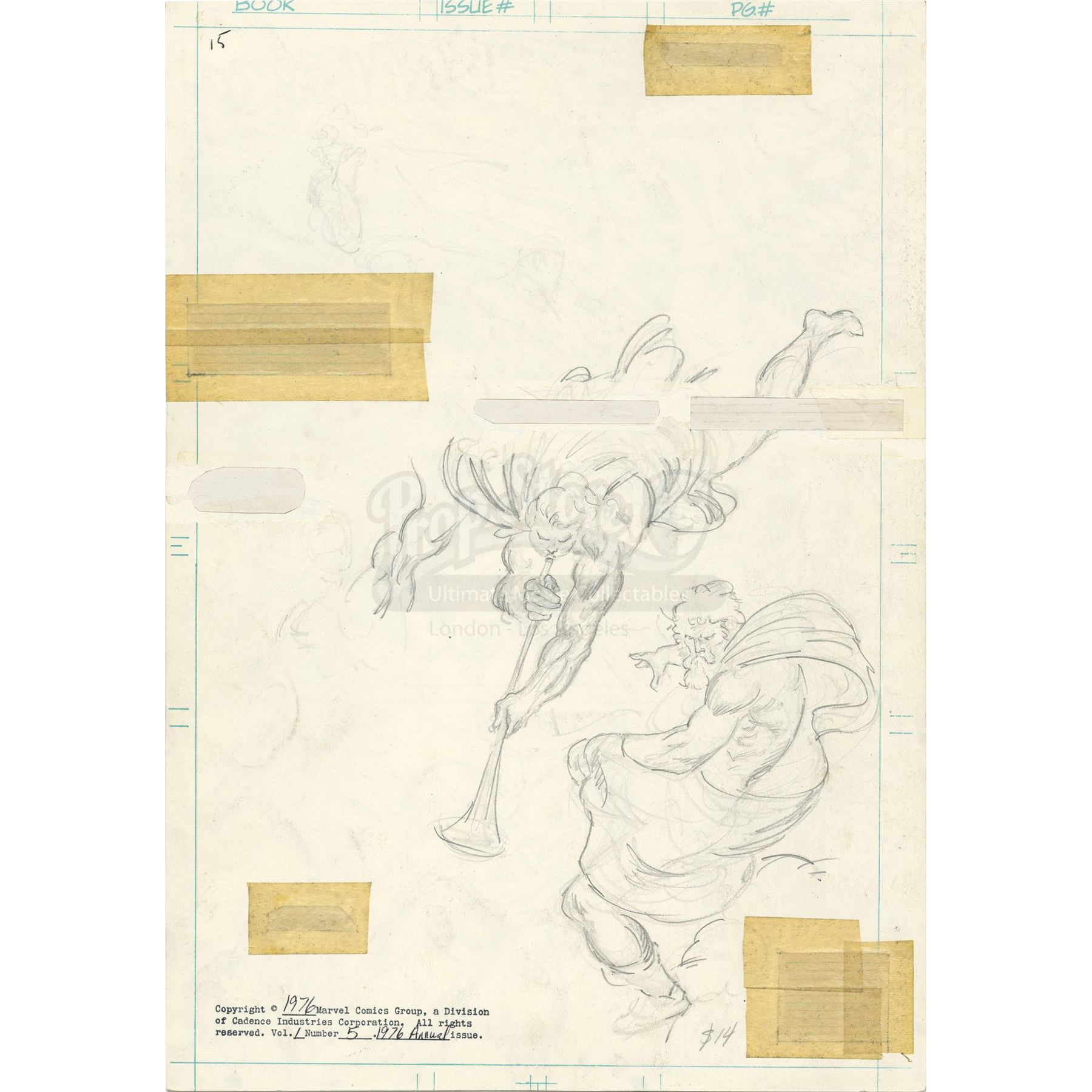 John Buscema (Penciler), Tony DeZuniga (Inker)Marvel Comics, September 1976War of the Gods! King-size annual with battle between Hercules and Thor. Features handwritten notations and two incomplete character illustrations by John Buscema on the back.Condition:Good; some intentional cuts to the paper during production; tape on the reverse.Dimensions: 16" x 11.5" x 1" (40cm x 28.75cm x 2.5cm)$1,200-1,800