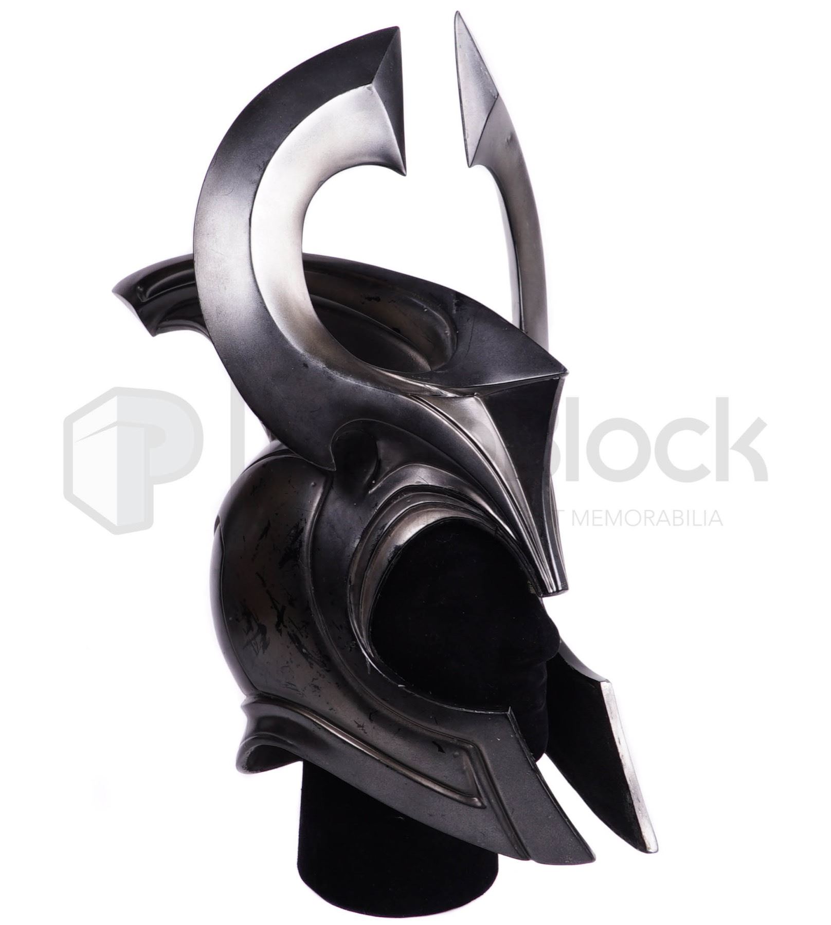 Helmet worn by the guards of Asguard in the 2011 Marvel superhero film Thor. This style of helmet can be seen throughout the film as all the guards in Asguard wear them. Made of a dense, urethane rubber, this piece has been painted a metallic silver with gold over it, some of the gold is worn down. The helmet is lined and remains in excellent, production used condition.