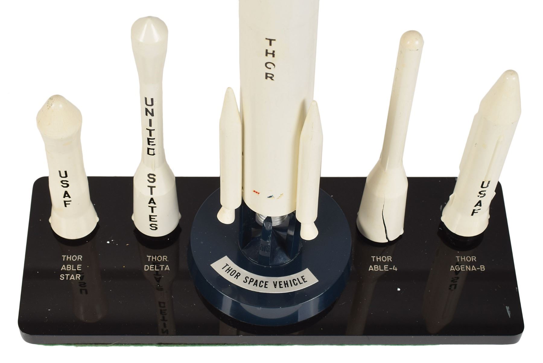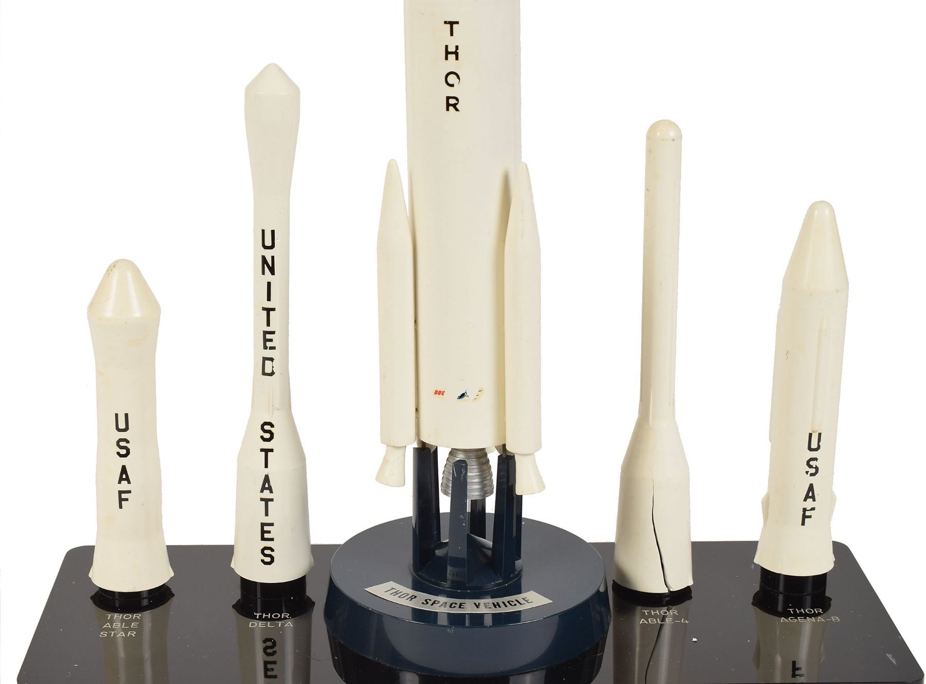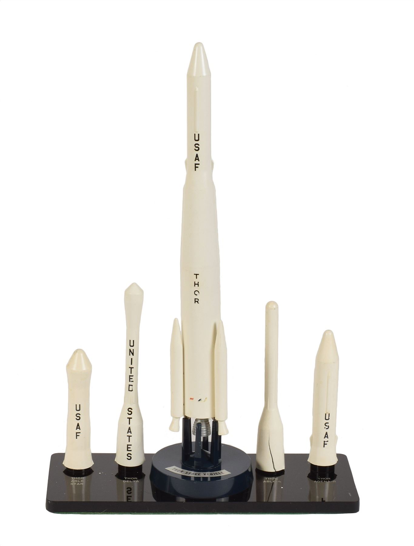 Very attractive vintage Thor space vehicle display, consisting of models for the Thor Able Star, the Thor Delta, the Thor Able–4, the Thor Agena–B, and a large central Thor rocket, ranging in size from 16? to 5.25? in height. Includes the 13.5 x 5 plastic display base. In very good to fine condition, with cracks to the base of each of the smaller rockets, and some scattered wear and scuffs. From the personal collection of Charlie Dry, a former Apollo test astronaut and research engineer and senior scientific analyst at NASA. The Thor rocket was the first in a large family of space launch vehicles that came to be known as Delta, and on August 7, 1959, a Thor-Able was used to successfully launch Explorer 6, the first satellite to transmit pictures of Earth taken from orbit.