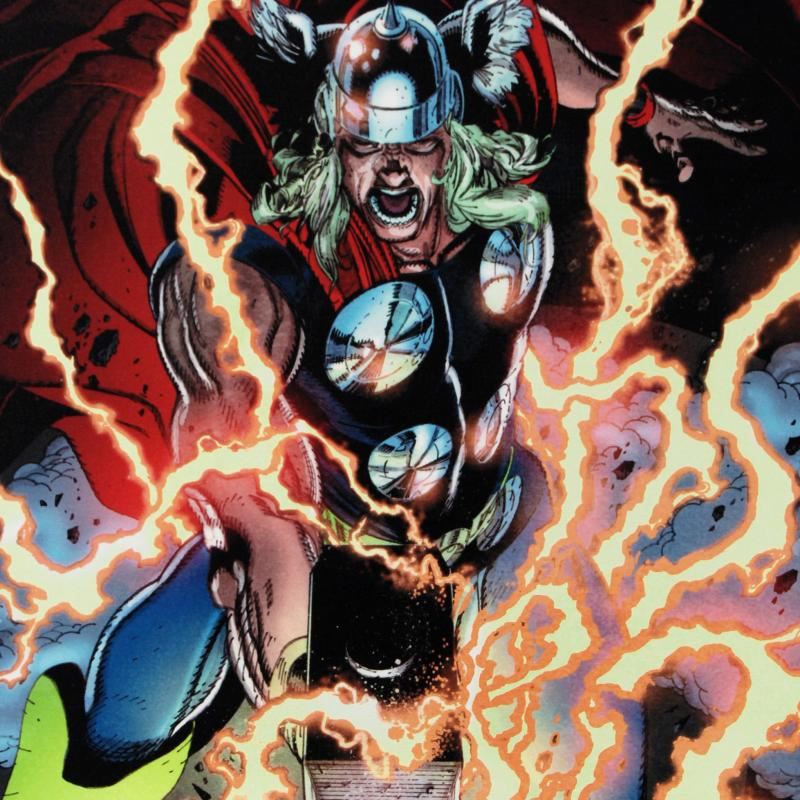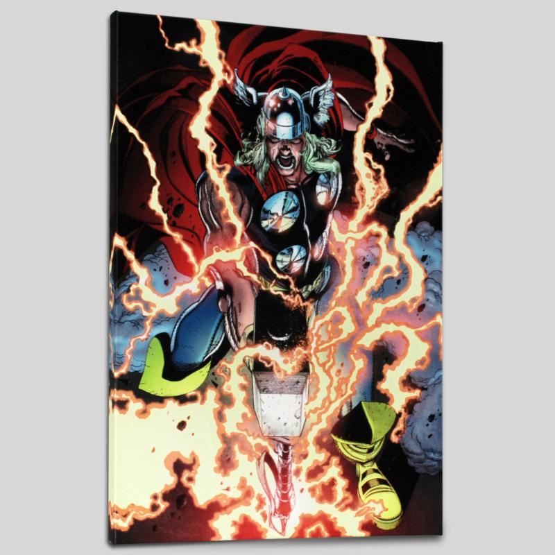 A piece of comic book history, this limited edition, from original art by Tan Eng Huat, depicts Thor in a blaze of glory. Named 'Best New Talent' in the National Comics Awards (NCA) 2002, Tan Eng Huat has been a featured artist for different comic companies such as Marvel. He is most recognized for his work on the Punisher, Ghost Rider, Annihilators, and Deadpool comics. "Thor First Thunder #1" is a limited edition giclee on canvas by Tan Eng Huat presented by Marvel Comics! This piece comes gallery wrapped and ready to hang. Includes Certificate of Authenticity! Measures approx. 18" x 27" (image).