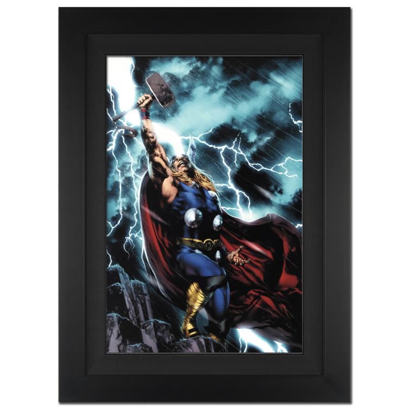 A piece of comic book history, this limited edition, from original art by Jay Anacleto, depicts a mighty Thor. Efren "Jay" Anacleto is best known for his highly detailed and photo-realistic pencil work on 'Aria' for Image Comics. His most notable Marvel work is from the 'Marvels: Eye of the Camera' series. "Thor First Thunder #1" is an extremely limited edition giclee on canvas by Jay Anacleto presented by Marvel Comics, hand signed by the great Stan Lee and numbered out of only 10! This piece has been custom framed and ready to hang. Includes Certificate of Authenticity! Measures approx. 25" x 34" (with frame); 18" x 27" (image).