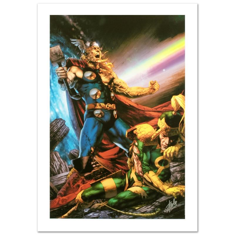 A piece of comic book history, this limited edition, from original art by Jay Anacleto, depicts Thor and Loki after and epic battle. Efren "Jay" Anacleto is best known for his highly detailed and photo-realistic pencil work on 'Aria' for Image Comics. His most notable Marvel work is from the 'Marvels: Eye of the Camera' series. "Thor: First Thunder #5" a limited edition giclee on canvas by Jay Anacleto presented by Marvel Comics, numbered and hand signed by the great Stan Lee! Includes Certificate of Authenticity! Measures approx. 18" x 27" (image).