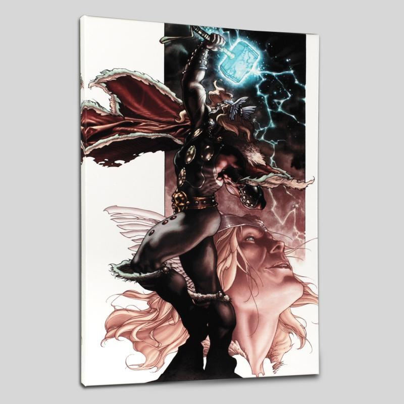 A piece of comic book history, this limited edition, from original art by Simone Bianchi, depicts the classic character Thor. Known for his use of ink wash in his work, Simone Bianchi is an Italian comic book artist famous for his X-Men Unlimited artwork. "Thor: For Asgard #3" is a limited edition numbered giclee on stretched canvas by Simone Bianchi presented by Marvel Comics. This piece is gallery wrapped and ready to hang. Includes Certificate of Authenticity! Measures approx. 18" x 27" (image); 1.5" (depth).
