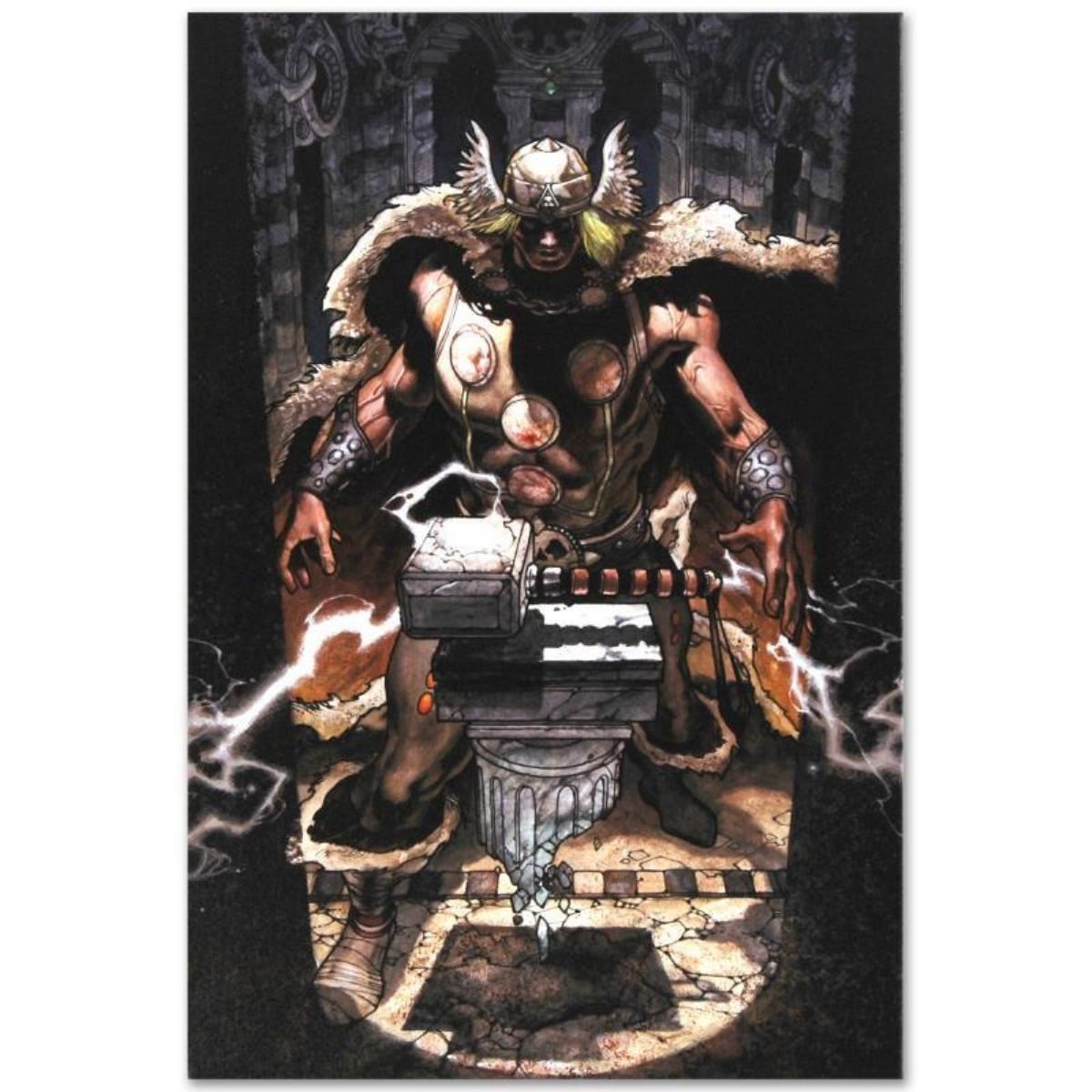 A piece of comic book history, this limited edition, from original art by Simone Bianchi, depicts a mighty Thor. Known for his use of ink wash in his work, Simone Bianchi is an Italian comic book artist famous for his X-Men Unlimited artwork. "Thor: For Asgard #6" is a limited edition giclee on canvas by Simone Bianchi presented by Marvel Comics. This piece comes gallery wrapped. Includes Certificate of Authenticity! Measures approx. 18" x 27" (image); approx. 1.5" (depth). This item requires special handling and may have a longer than usual turnaround.