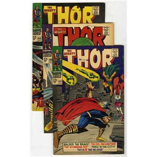 <B>Thor Group (Marvel, 1967-68) Condition: Average VF.</B></I> Contains #143, 144, 145, #147 (origin of the Inhumans), #148 (origin of Black Bolt), and 150. Approximate Overstreet value for group = $250. <I> From the Madison Monk Collection.</B></I><BR><BR><b>Shipping:</b> Comics - Unslabbed (<a target="_blank" href="http://www.heritageauctions.com/common/shipping.php">view shipping information</a>)