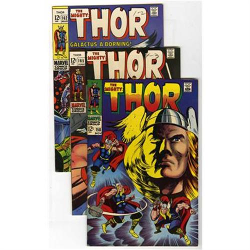 <B>Thor Group (Marvel, 1968-69) Condition: Average VF.</B></I> Contains #151, 157, #158 (origin retold), #159 (origin of Dr. Blake), 160, 161, #162 (origin of Galactus), and 165. Jack Kirby art is prevalent. Approximate Overstreet value for group = $300. <I> From the Madison Monk Collection.</B></I><BR><BR><b>Shipping:</b> Comics - Unslabbed (<a target="_blank" href="http://www.heritageauctions.com/common/shipping.php">view shipping information</a>)
