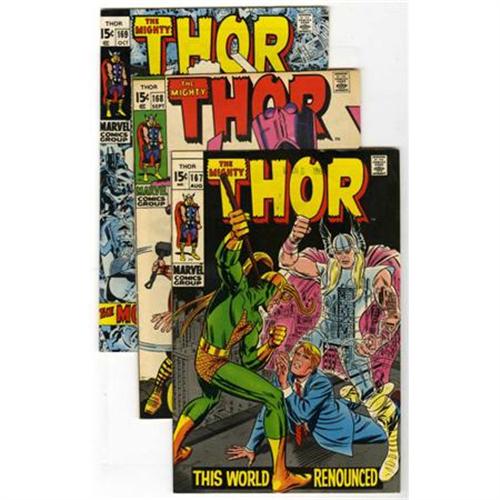 <B>Thor #167-173 Group (Marvel, 1969-70) Condition: Average VF.</B></I> Includes #167, #168 (origin of Galactus), #169 (origin of Galactus ends), 170, 171, 172, and 173. Jack Kirby art in all. Approximate Overstreet value for group = $200. <I> From the Madison Monk Collection.</B></I><BR><BR><b>Shipping:</b> Comics - Unslabbed (<a target="_blank" href="http://www.heritageauctions.com/common/shipping.php">view shipping information</a>)
