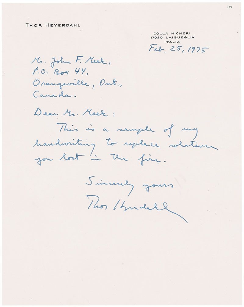 Norwegian ethnographer and adventurer (1914–2002) best known for the Kon-Tiki expedition, during which he tested the theory of early contact between South America and Polynesia by successfully sailing a raft across the Pacific Ocean. ALS, one page, 8.5 x 11, personal letterhead, February 25, 1975. Brief note to a collector. In full: “This is a sample of my handwriting to replace whatever you lost in the fire.” In fine condition, with central horizontal and vertical fold. Accompanied by one of Heyerdahl’s personal business cards.