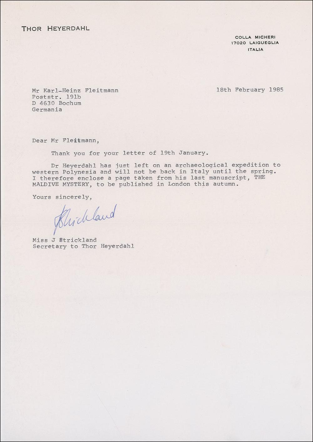 Norwegian ethnographer and adventurer (1914–2002) best known for the Kon-Tiki expedition, during which he tested the theory of early contact between South America and Polynesia by successfully sailing a raft across the Pacific Ocean. Unsigned handwritten manuscript page from Heyerdahl’s The Maldive Mystery, in pencil, one 8.25 x 11.75 lined off-white page. Manuscript reads in part: “Before an island was discovered and its position known, nobody could guess at what would be the nearest land from where to set course. Winds and currents set the course of accidental drifts, and the sun and the stars guided those who set sail with a premeditated plan.” Accompanied by the original mailing envelope. Accompanied by a 1985 TLS from Heyerdahl’s secretary, stating Heyerdahl was on an expedition to Polynesia, but she was enclosing a page from his manuscript. In fine condition, with bisecting folds to manuscript, as well as uniform toning. RRAuction COA.