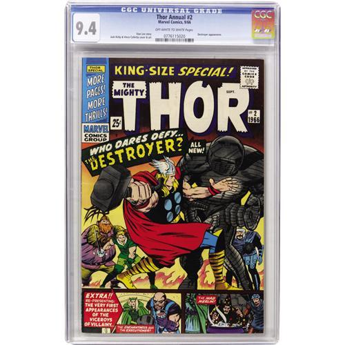 <B>Thor King-Size Special #2 (Marvel, 1966) CGC NM 9.4 Off-white to white pages.</B></I> Destroyer appearance. Jack Kirby cover and art. Overstreet 2006 NM- 9.2 value = $110. CGC census 3/07: 8 in 9.4, 4 higher.<BR><BR><b>Shipping:</b> Comics - Slabbed (certified) (<a target="_blank" href="http://www.heritageauctions.com/common/shipping.php">view shipping information</a>)