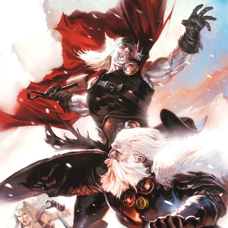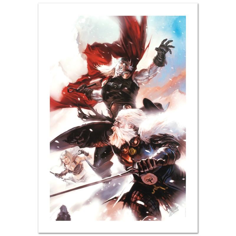 A piece of comic book history, this limited edition, from original art by Clay Mann, depicts Thor and Odin in an epic battle. Clay Mann is a comic book artist currently working for Marvel Comics. Clay Mann's artistic endeavors include titles such as Daredevil, Dark Reign: Elektra, Heroes for Hire (Vol. 2) and X-Men: Legacy. "Thor: Man of War #1" is a limited edition giclee on canvas by Clay Mann presented by Marvel Comics, numbered and hand signed by the Great Stan Lee (1922-2018)! Includes Certificate of Authenticity! Measures approx. 18" x 27" (image).