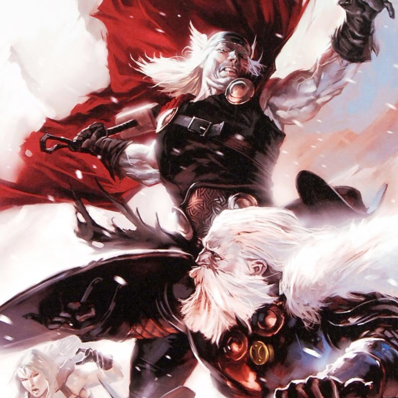 A piece of comic book history, this limited edition, from original art by Clay Mann, depicts Thor and Odin in an epic battle. Clay Mann is a comic book artist currently working for Marvel Comics. Clay Mann's artistic endeavors include titles such as Daredevil, Dark Reign: Elektra, Heroes for Hire (vol 2) and X-Men: Legacy. "Thor: Man of War #1" is a limited edition numbered giclee on stretched canvas by Clay Mann presented by Marvel Comics. This piece comes gallery wrapped. Includes Certificate of Authenticity! Measures approx. 18" x 27" (image); 1.5" (depth).
