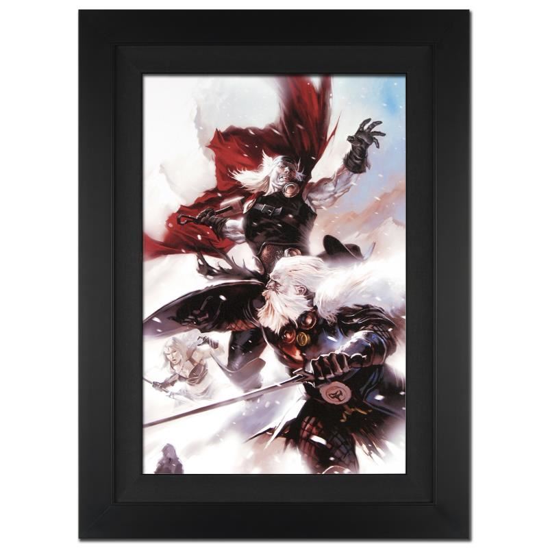 A piece of comic book history, this limited edition, from original art by Clay Mann, depicts Thor and Odin in an epic battle. Clay Mann is a comic book artist currently working for Marvel Comics. Clay Mann's artistic endeavors include titles such as Daredevil, Dark Reign: Elektra, Heroes for Hire (vol 2) and X-Men: Legacy. "Thor: Man of War #1" is a limited edition giclee on canvas by Clay Mann presented by Marvel Comics, hand signed by the great Stan Lee and numbered out of only 10! This piece has been custom framed and ready to hang. Includes Certificate of Authenticity! Measures approx. 25" x 34" (with frame); 18" x 27" (image).