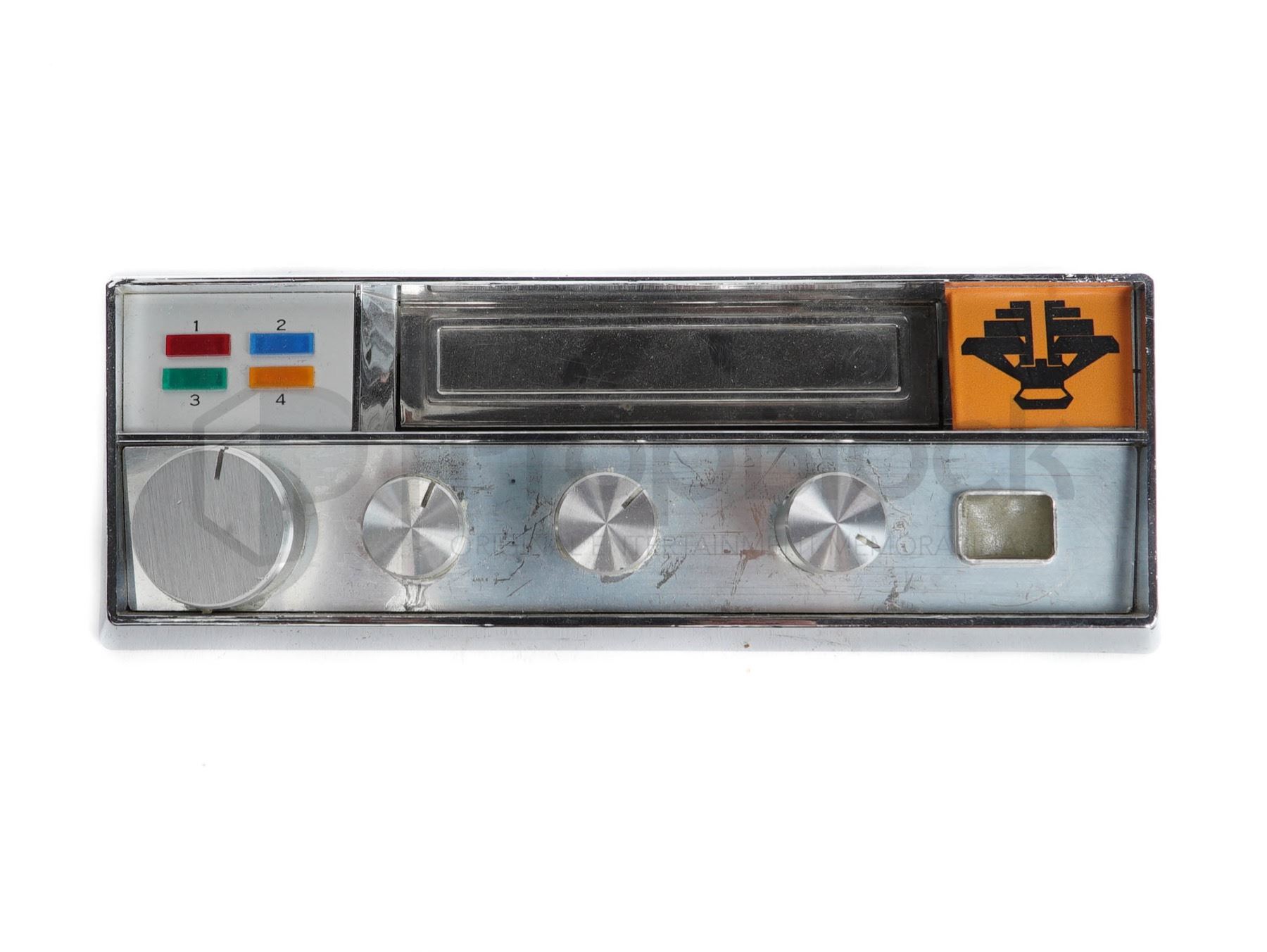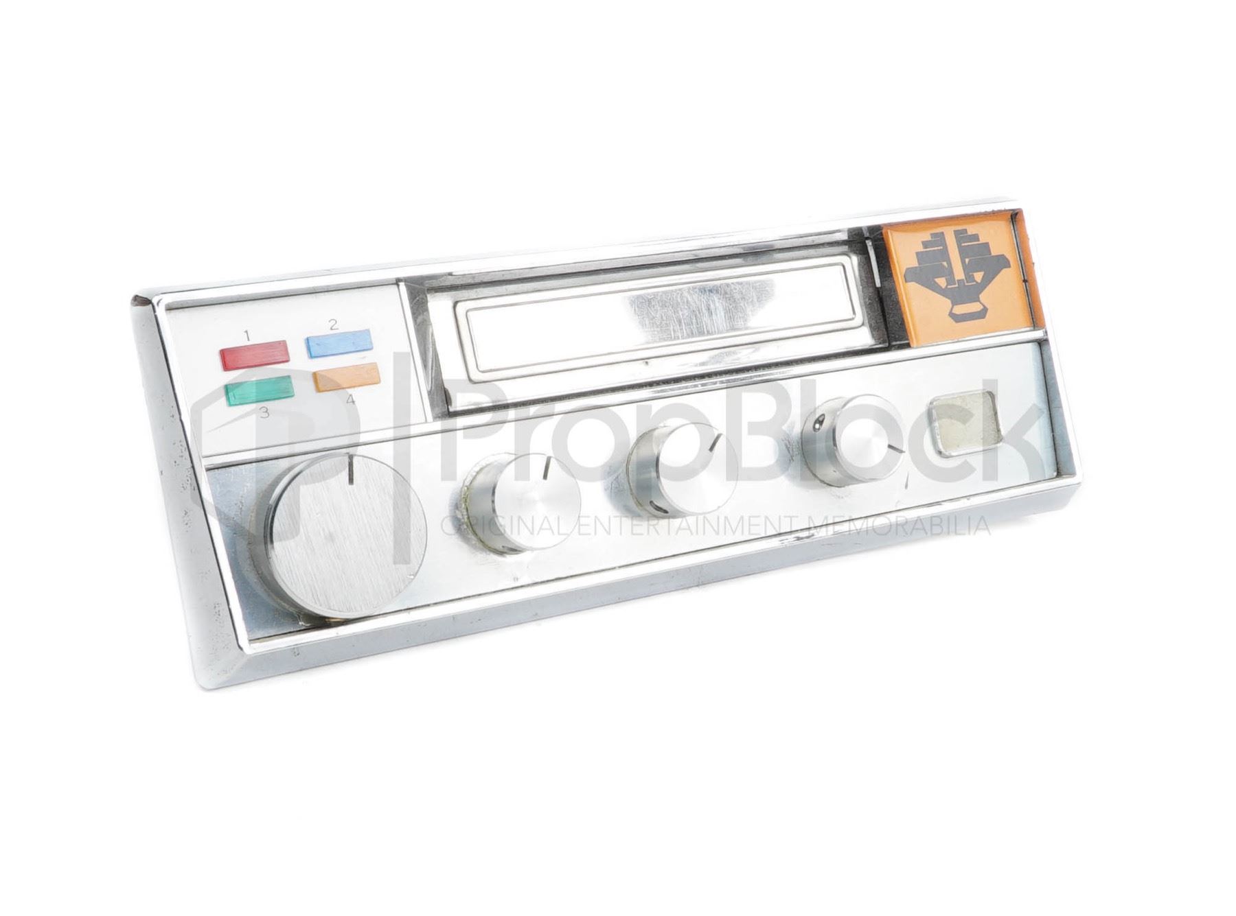 Interface panel featured in the Commodore ship in the Marvel film Thor: Ragnarök. These vintage style panels were used set decoration in the ship that was featured in the climactic battle of the film. This piece is a vintage style radio cover, chrome in color with applied decals. Item measures around 7" x 3" and remains in excellent, production used condition.