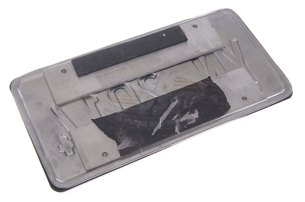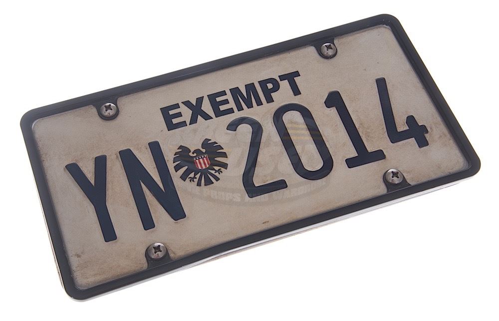 (Paramount Pictures, 2011) This prop license plate was custom-made by the production for use on various S.H.I.E.L.D. vehicles. The license plate is made of vacu-formed plastic with attached metal frame and aluminum brackets on back. Two sided tape is still applied to the back. The plate features raised letters and numbers, with applied stickers of the S.H.I.E.L.D. logo and "Exempt". Wear from use is present.