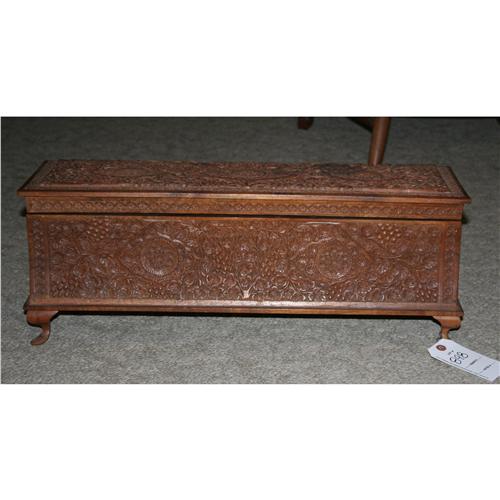 Thorens Music Box - Plays 4 ½" discs. This music box is set within a highly decorative case with relief carving. The case not only houses the music box, but also provides storage for accompanying discs. Ten compartments each hold a box which will hold 5 discs. Discs are included. Case measures 24" x 7 ½" x 9" H.