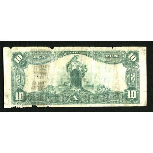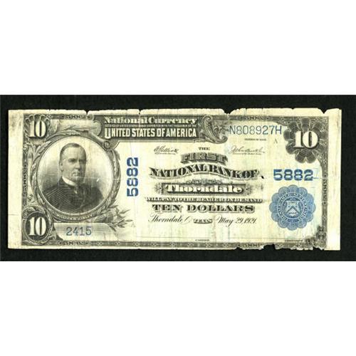 <B>Thorndale, TX</B></I> - $10 1902 Plain Back Fr. 633 <B>The First NB</B></I> Ch. # 5882 What this note lacks in condition it certainly makes up for in rarity. Thorndale had only one national bank and despite a total issue of $439,920, only $2,950 was reported outstanding when the bank was liquidated in 1933. This piece is a new addition to the census and represents only the second Series 1902 of six large size notes in total. Even the Philpott/Moody holdings lacks a Third Charter note on this Milam County bank. In fact the last large note on this bank to cross the auction block was in 1998. This $10 was once wet, the signatures are gone, and it has a number of notches, tears, and holes in the paper. No matter what this bank is rare. <B>Very Good-Fine.</B></I><BR><BR><b>Shipping:</b> Coins & Currency (<a target="_blank" href="http://www.heritageauctions.com/common/shipping.php">view shipping information</a>)