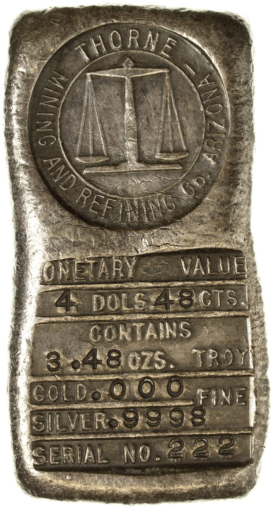 Obverse: Monetary Value/ 4 dols 48 cts / Contains/ 3.48 ozs. Troy / gold 000 / silver .9998 / seril no. 222; reverse: Blank.