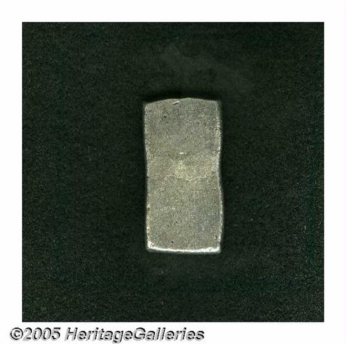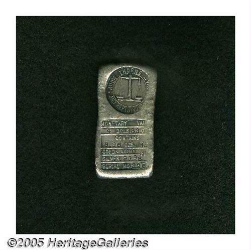 <B>Thorne Mining & Refining Co. Silver Ingot.</B></I> Many different histories have been written or fabricated regarding the Thorne ingots, which are somewhat common, with more than twenty known. To date, this author (Fred Holabird) has not found a specific mention of the Thorne Mining and Refining Co. in mining literature, despite an intensive search over many years, including various western state official records.<BR> These ingots are refined silver, and as such, indicate that they were sold directly by the Thorne company, and are not the result of a specific mining operation. Four different sources with the surname Thorne bear further study:<BR><BR> 1. Dan Thorne was a miner in Prescott, Arizona from the 1890s to 1905. He had some claims near the Congress area that were bought by the Clark Distillery of Illinois, indicating his ability to promote mines to speculators (perhaps just like the ingots).<BR> 2. The Thorne Copper Mining & Reduction Co. was based in Hawthorne, Nevada. In the 1908 <I>Copper Handbook,</B></I> Stevens wrote that the company had similar "twin" companies operating around the same area. Curiously, this area is just over the range from Rawhide, the site of the Nevada Silver Co. ingot promotion a number of years later. This company was out of business by 1918.<BR> 3. Thorne, Alaska was the site of gold mining. In 1927 the Thorne Arm Mining Co. was active there.<BR> 4. Isaac N. Thorne, a lawyer, was the president of the Pacific Metallurgical Works in San Francisco in 1879. He was still a lawyer in 1886, but the PMW was out of business. No Thorne mining companies were listed in the San Francisco Directories of the period. Summary: There is no conclusive evidence of where or when these ingots were made.<BR> This small-sized ingot has the individual imprint of: 4 DOLS 33 CT / 3.36 OZS / GOLD .000 / Silver .9998 / SERIAL NO 296. Medium gray-blue patina is more prevalent on the top side.<BR><I>From The Alan Bingel Collection.</B></I>