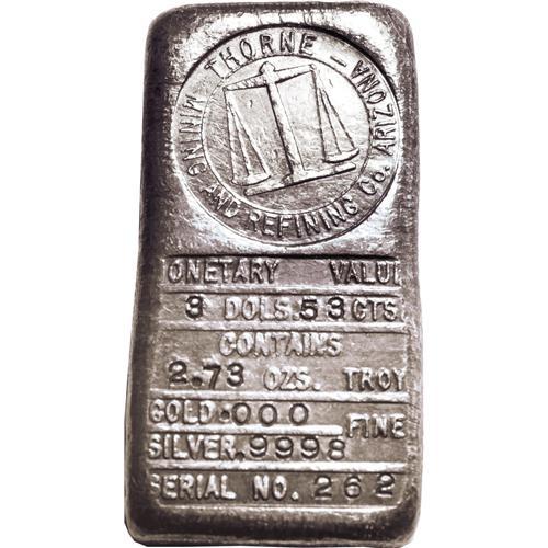 <B>Thorne Mining and Reduction Co.</B></I> Arizona. The silver ingots from Thorne are relatively common, especially compared to those in gold. This item has the usual layout for Thorne ingots with the company imprint at the top, followed by MONETARY VALUE / 3 DOLS 53 CTS / CONTAINS / 2.73 OZS TROY / GOLD .000 FINE / SILVER .9998 / SERIAL NO. 262. The silver-gray surfaces have taken on a pronounced bluish cast and there are few handling marks present.<BR><I>From The Kagin Reference Collection of Frontier Ingots.</B></I>