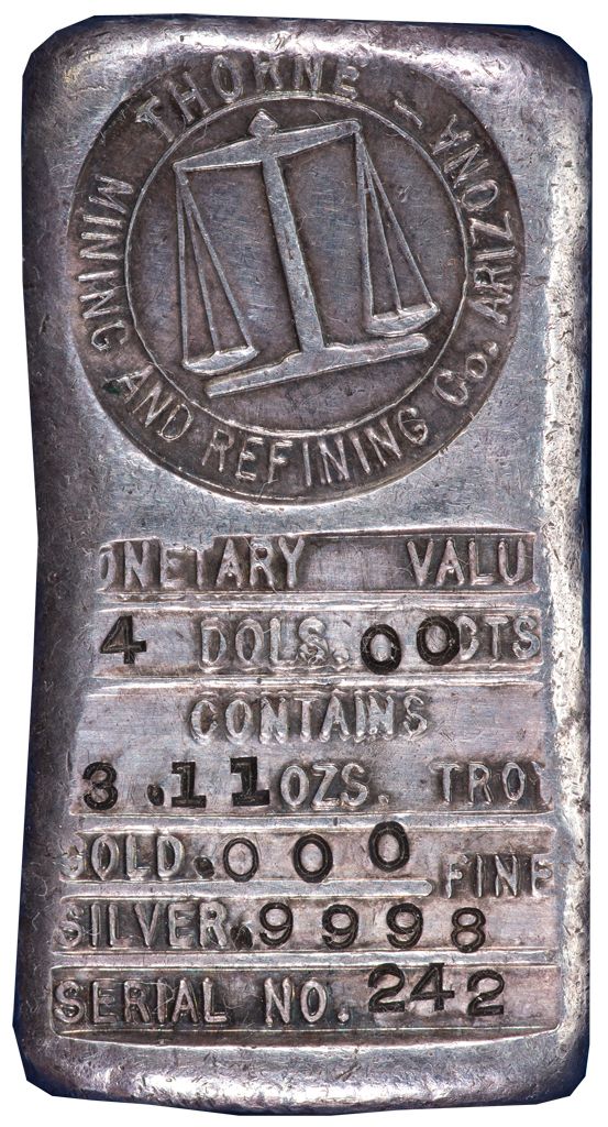 This is an original, "Thorne Mining and Refining Co.," Silver Ingot, Eureka District of Arizona, with the unique, company mining scale logo stamped at top, along with the official weight and purity and serial number, below. The ingot contains no gold, the silver is .9998 fine, weighs 3.11 troy ounces, and was valued at the time of manufacture at $4. The serial number for this bar is 242. Thorne Mining & Refining Co. was operating around the 1890s in the Eureka District of Arizona. The Thorne ingots have been attributed to Prescott, Arizona from the 1890s. We were unable to verify this, and assume it was an assumption by prior writers, rather than hard fact. We found two companies of similar name, and a miner and prospector with the same name. A) Dan C. Thorn (e) (spelled both ways) was a miner in the Congress and Prescott area from the 1890s through about 1905, living in the Eureka district not too far from Bagdad, the site of a major open pit copper mine in later years. Thorn sold his claim groups in Congress in 1895-7 which were bought by the C. Clark Distillery of Illinois. Thorn lived in Prescott for some time. His father built the Palace Bar, a well known “watering hole.” There is no record of a Thorne Mining & Refining Co. in the Prescott records [Ref: Arizona Mining Directory of 1903 by Millward; Sharlot Hall Museum (Prescott) biographical file on Dan Thorn(e). B) The Thorne Copper Mining & Reduction Co. was based in Hawthorne, Esmeralda Co., Nevada. Stevens in 1908 wrote that this company had some “twin” companies with similar names that were all active around Walker Lake. We were unable to find specific reference to the Thorne Mining & Reduction Co., but it could certainly be one of the Esmeralda properties [Ref: Copper Handbook v8 p 1317] C) A third reference needs to be checked out. There was a Thorne, Alaska that was an active gold area. In 1927-8, the Thorne Arm Mining Co. was active on the Thorne Arm on Revillagigedo Island [Ref: Mines Handbook, p 235]. More work is needed to identify the source of this ingot. "These ingots have long been thought to be a creation of the 1950s. However, I finally did find an original 1904 ledger from Arizona for this exact same name company. The style of manufacture, however, does not generally lend itself to an early 1900s bar - it is similar in many respects to the Hoard ingots, which are not from the 19th century." [Ref: Fred Holabird]. -59042