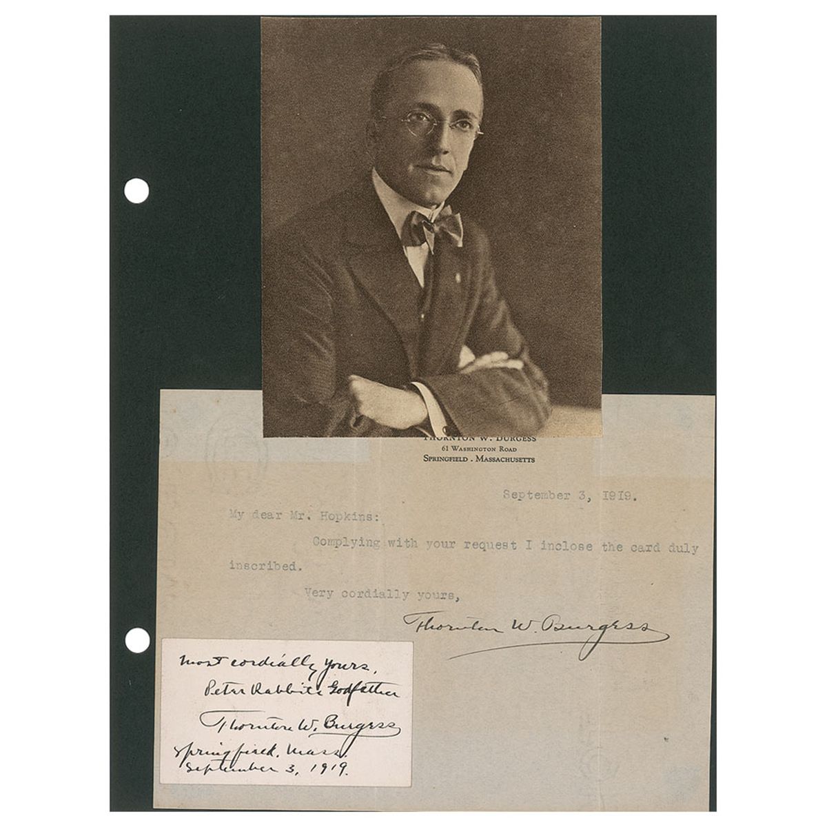 American author (1874–1965) best known for his popular children’s stories featuring a colorful cast of animal characters, including Peter Rabbit. Two items: TLS signed, “Thornton W. Burgess,” one trimmed page, personal letterhead, 7.25 x 5.5, September 3, 1919. In a response to an admirer, Burgess writes, in full: “Complying with your request I inclose the card duly inscribed”; and a vintage signature, “Most cordially yours, Peter Rabbit’s Godfather, Thornton W. Burgess, Springfield, Mass, September 3, 1919.” Both items are affixed to an 8 x 10.5 album page. In overall fine condition, with intersecting folds to the TLS, one passing through the “g” in “Burgess,” a uniform block of toning over the text, and some light soiling to the card.