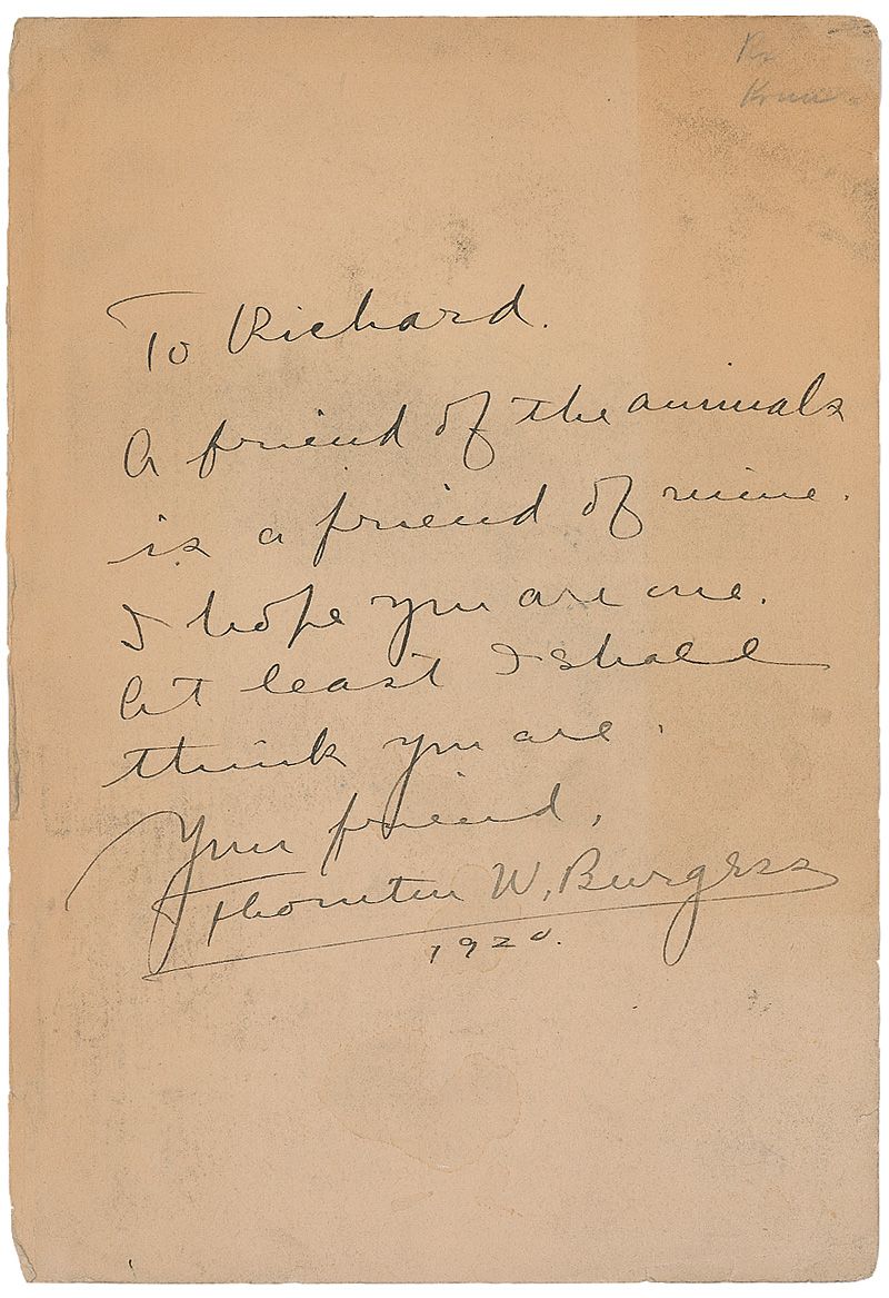 ALS signed “Thornton W. Burgess,” one page, 5.25 x 7.75, 1920. Letter to an admirer. In full: “A friend of the animals is a friend of mine. I hope you are one. At least I shall think you are.” In very good condition, with overall toning with a heavier block to the right side, scattered soiling, and a few creases.