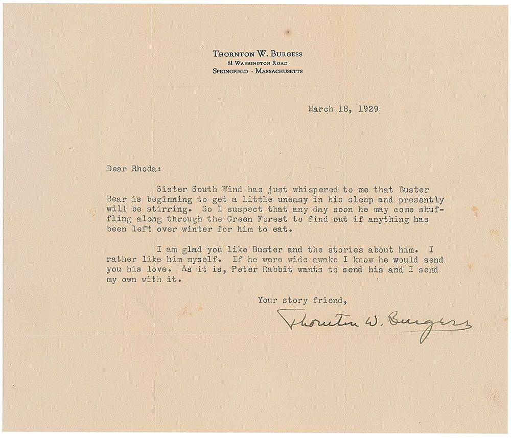 TLS signed “Thornton W. Burgess,” one page, 8.25 x 7, personal letterhead, March 18, 1929. Letter to an admirer. In full: “Sister South Wind has just whispered to me that Buster Bear is beginning to get a little uneasy in his sleep and presently will be stirring. So I suspect that any day soon he may come shuffling along through the Green Forest to find out if anything has been left over winter [sic] for him to eat. I am glad you like Buster and the stories about him. I rather like him myself. If he were wide awake I know he would send you his love. As it is, Peter Rabbit wants to send his and I send my own with it.” Intersecting folds passing through parts of the signature, and light foxing and toning, otherwise fine condition. Accompanied by the original mailing envelope.