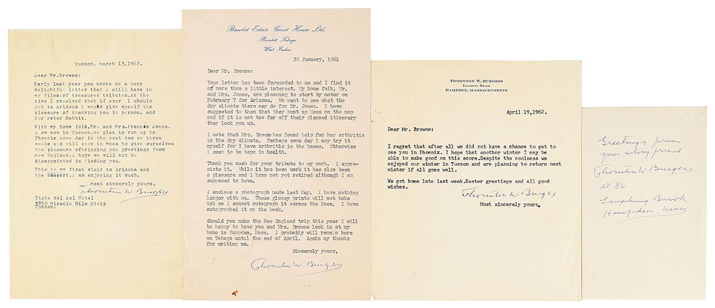 Four items: a vintage glossy 3.5 x 5.5 photo of Burgess in a half-length pose, signed on the reverse in black ballpoint, "Greetings from your story friend, Thornton W. Burgess, at 86, Laughing Brook, Hampden, Mass."; and a group of three TLSs, each signed "Thornton W. Burgess," each one page, dated between 1961 and 1962, each addressed to Ken Brown. The earliest letter, January 28, 1961, in part: "I enclose a photograph made last May. I have nothing larger with me. These glossy prints will not take ink so I cannot autograph it across the face. I have autographed it on the back." The second, March 13, 1962, in part: "Early last year you wrote me a very delightful letter that I still have in my files of treasured tributes. At the time I resolved that if ever I should get to Arizona I would give myself the pleasure of thanking you in person, and for Peter Rabbit…I am now in Tucson. We plan to run up to Phoenix some day in the next two or three weeks and will stop in Mesa to give ourselves the pleasure of bringing you greetings." The third letter, April 19, 1962, in part: "I regret that after all we did not have a chance to get to see you in Phoenix." In overall very good to fine condition, with staple holes to the upper left corners.